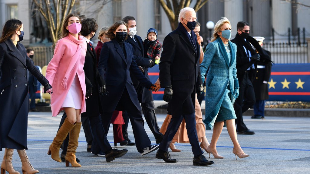 Последний кусочек пути Байден и его многочисленные родственники прошли пешком по зачищенной Пенсильвания Авеню. Иногда президент подбегал к оградке, перекинуться парой слов с прессой.