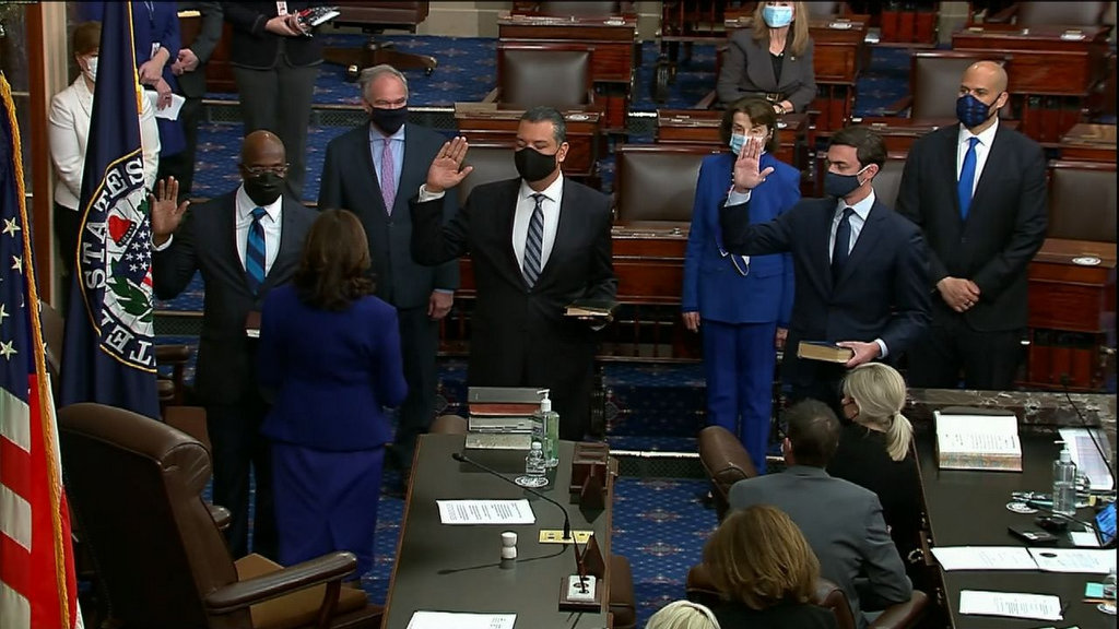 Ещё одна важная политическая новость сегодняшнего дня: работу в Сенате начали двое демократов, которые выиграли выборы второго тура в Джорджии. Это значит, что баланс мандатов в верхней палате Конгресса теперь разделен поровну: 50 республиканцев, и 50 демократов.