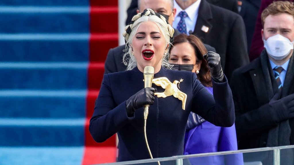 Гимн США спела Леди Гага, держа в руках золотой микрофон.