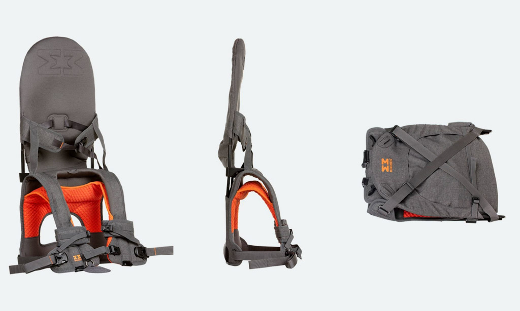 Этот стульчик надевается взрослому через голову (он довольно туго затягивается на груди, и рассчитан больше на мужчин), обычно уже после того, как ребёнок надёжно пристёгнут всеми лямками. А когда снимаешь, он складывается до довольно компактного, почти плоского размера. Можно носить на ремешке через плечо, или убрать в большой рюкзак.