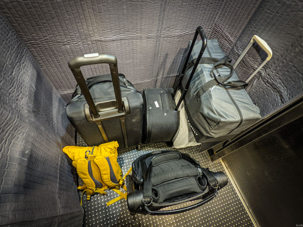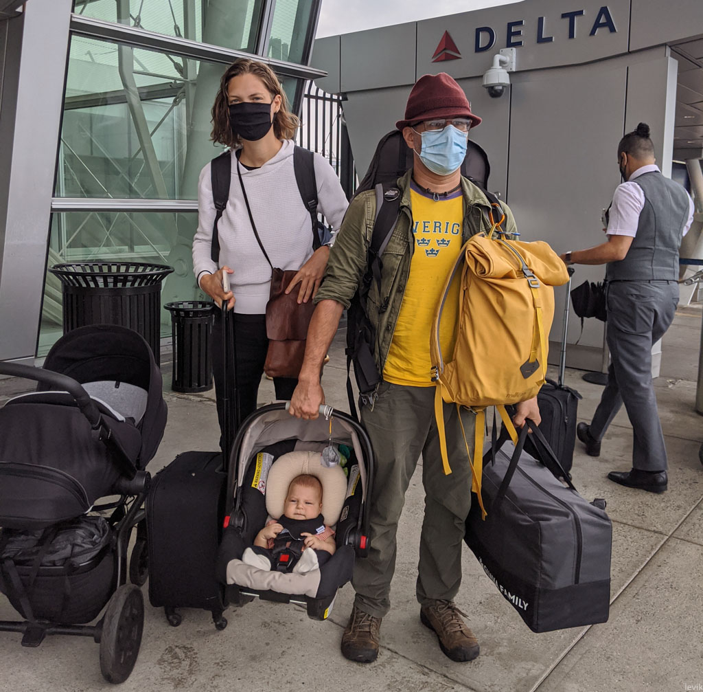 С самолётами нам повезло. Дельта до сих пор оставляла среднее сидение свободным из-за ковида, так что нам всегда было куда припарковать эту Дуну в самолёте. По прилёту, очень удобно: поднял за ручку, вынес через салон до телетрапа, там уже раскладываешь колёсики, и дальше толкаешь как коляску.