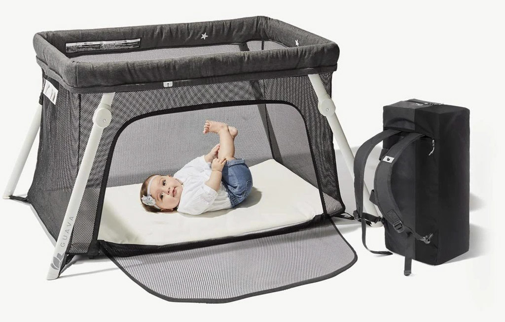 Эту штуку мы купили ещё летом, перед поездкой в Йеллоустоун. Из складных переносных манежиков она была самая лёгкая, и с лучшими отзывами. Правда, как на манеж на неё рассчитывать не стоит - даже в Айином возрасте эта штука уже тесновата для того, чтоб в ней играться. Зато как переносная кроватка служит отлично.Guava помещается в эдакую прямоугольную сумку-рюкзачок, которую мы отдельно сдавали в багаж. На фотографиях выше видны её размеры в сложенном виде. Первые пару раз я путался в том, как её правильно расставлять и складывать, но теперь обе процедуры занимают где-то по 1-2 минуты.