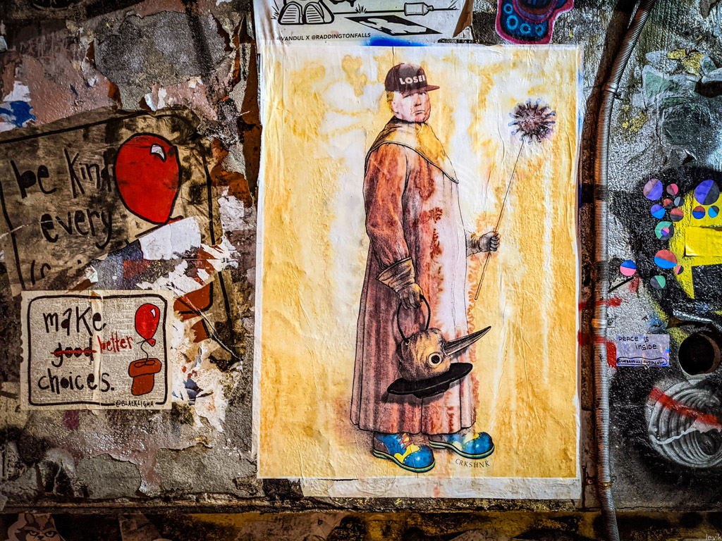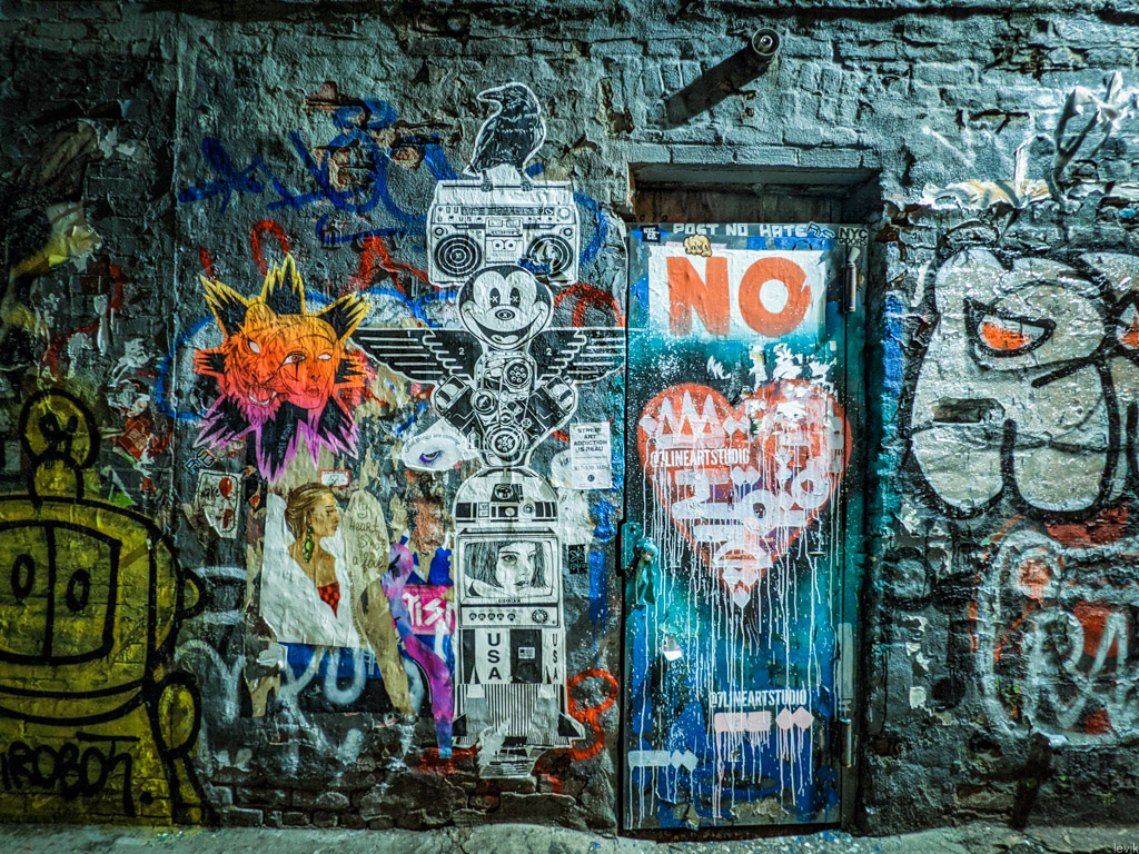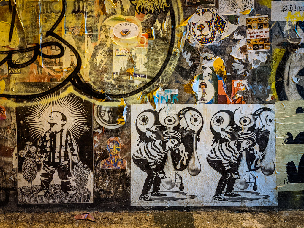 3. В результате каждые несколько месяцев внешний вид переулка сильно меняется, но под "свеженькими" картинками часто можно заметить остатки того, что было раньше. А ещё из-за этого здесь занят каждый квадратный сантиметр. Если внимательно смотреть, можно замечать всё новые и новые детали. Можете попробовать с фотографиями этого поста: даже там, где есть "главный" сюжет, по краям внимательный зритель заметит кучу всего интересного!