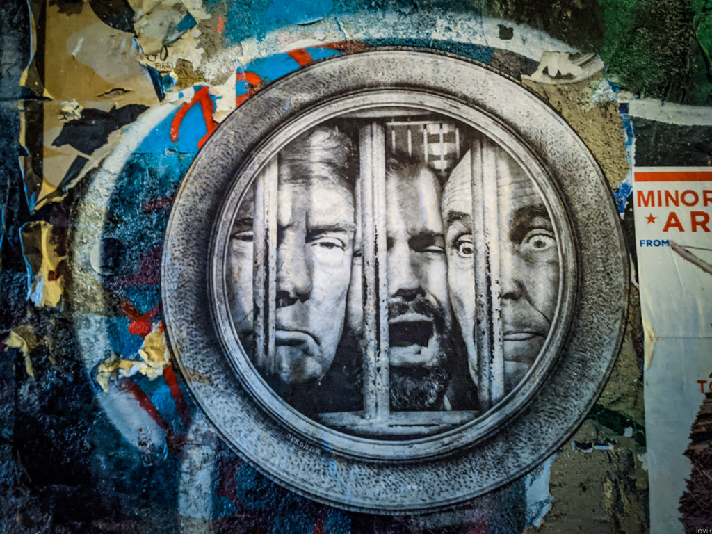 13. А тут Трамп изображён за решёткой вместе со своим старшим сыном (Дональдом Младшим), и адвокатом Руди Джулиани.