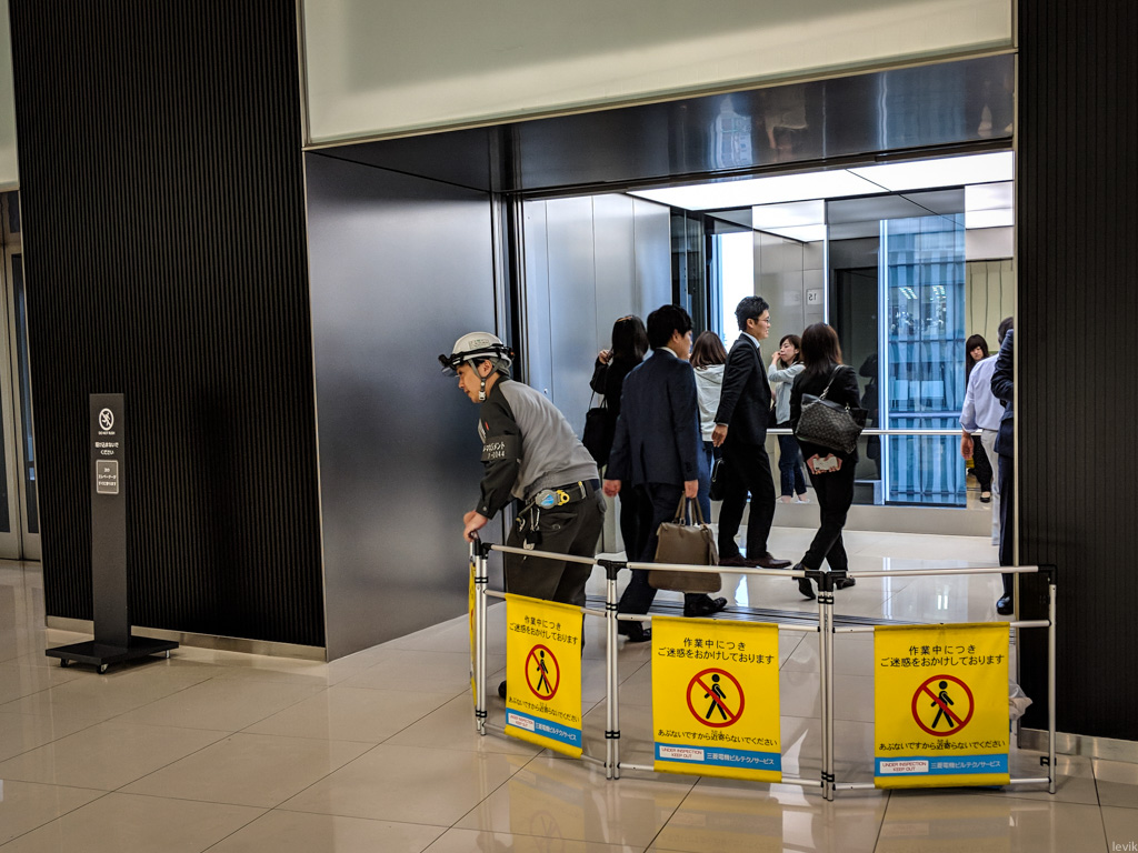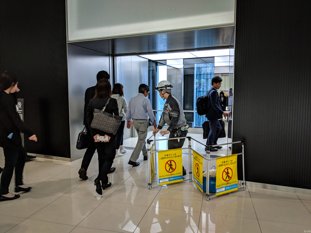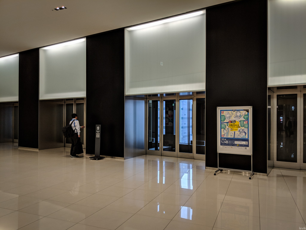 В Осаке далеко не самый интересный из офисов Гугла в мире, просто небольшое помещение в крупном деловом здании недалеко от одной из главных железнодорожных станций города. Одна из причин, почему я недолюбливаю Осаку в том, что я всё время теряюсь в трёхмерном лабиринте, который образуют подземные и надземные переходы между многочисленными торговыми центрами того района. Небоскрёб, где расположен наш офис тоже является частью этого скопления переходов и людей. Как водится, на нижних этажах там шоппинг, а верхние отданы под различные конторы. Всем офисным работникам надо подняться на лифте на распределительный этаж, где находится лобби.