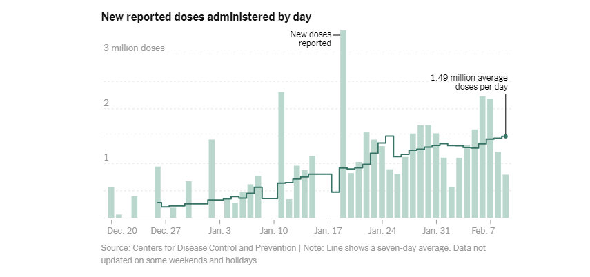 Но всё же, с момента, как Байден вступил в должность, количество доз, которые доставляют штатам для распространения выросло на 28% - сейчас доставки проходят на уровне 11 миллионов доз в неделю. Президент обещал, что они будут продолжать расти.
