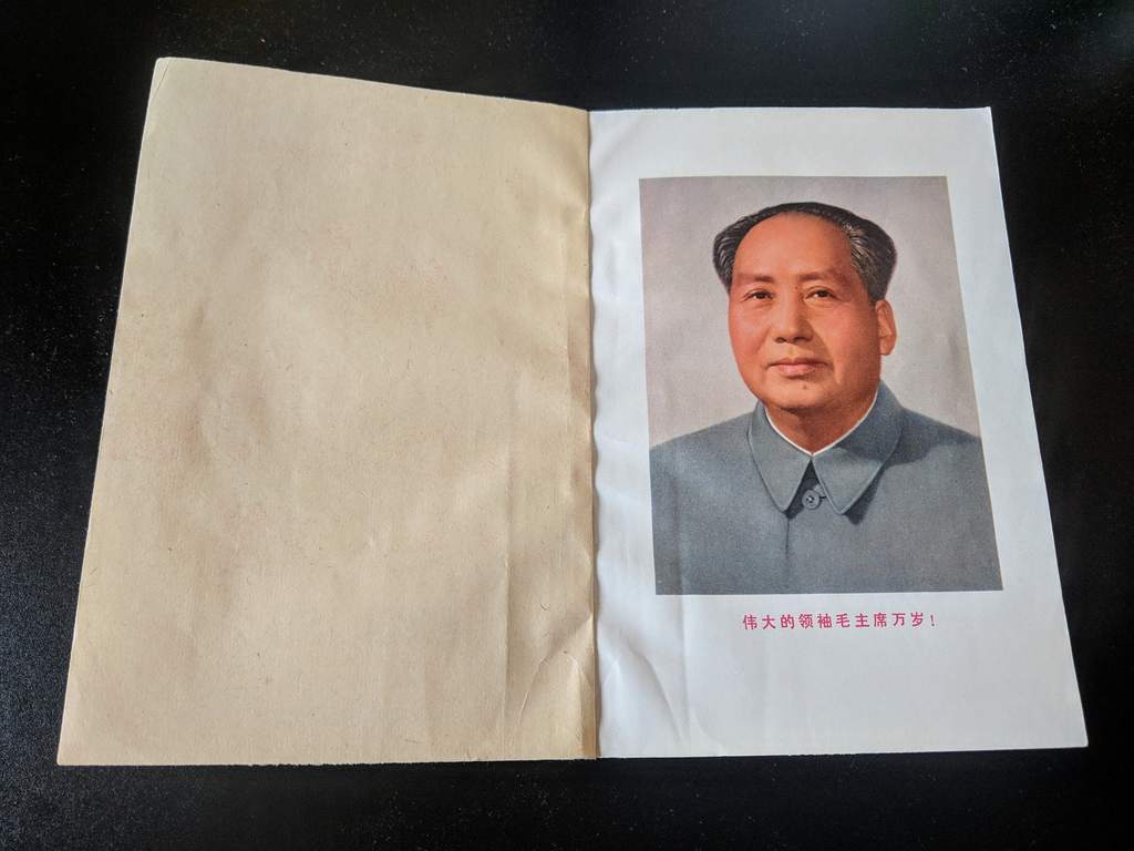 2. Вообще весь этот буклет чёрно-белый, с добавлением красного на обложке. Но издатели решили с уважением отнестись к товарищу Мао, и вклеили в первый разворот книжицы его полноценный цветной портрет.
