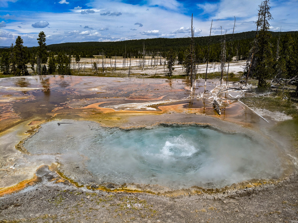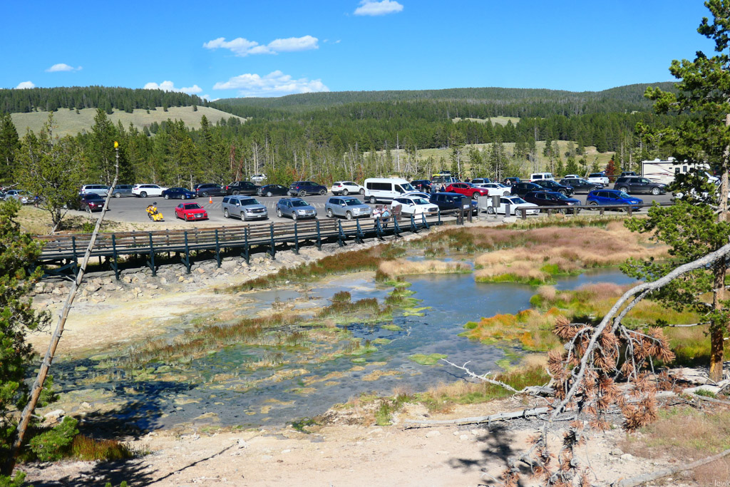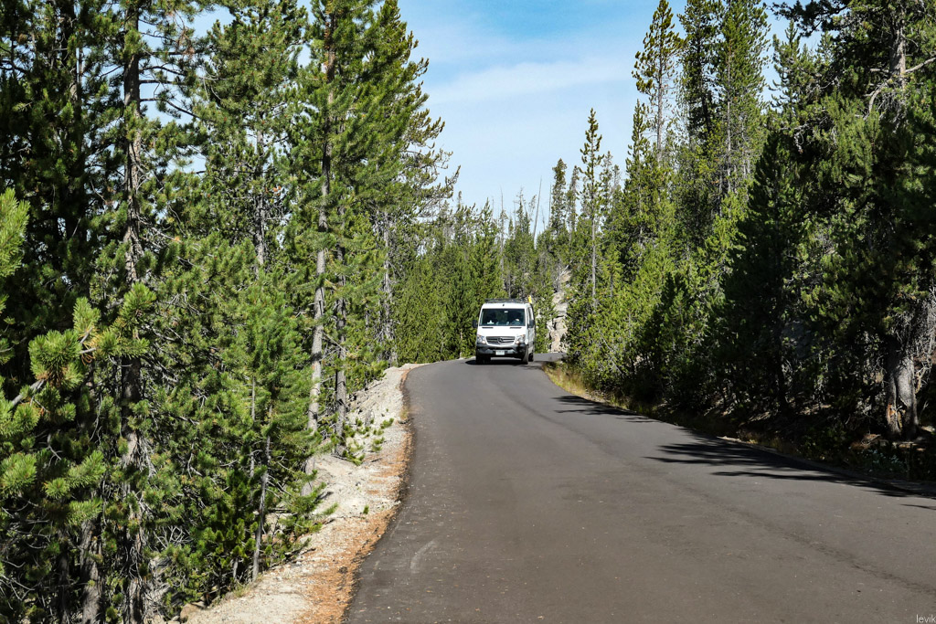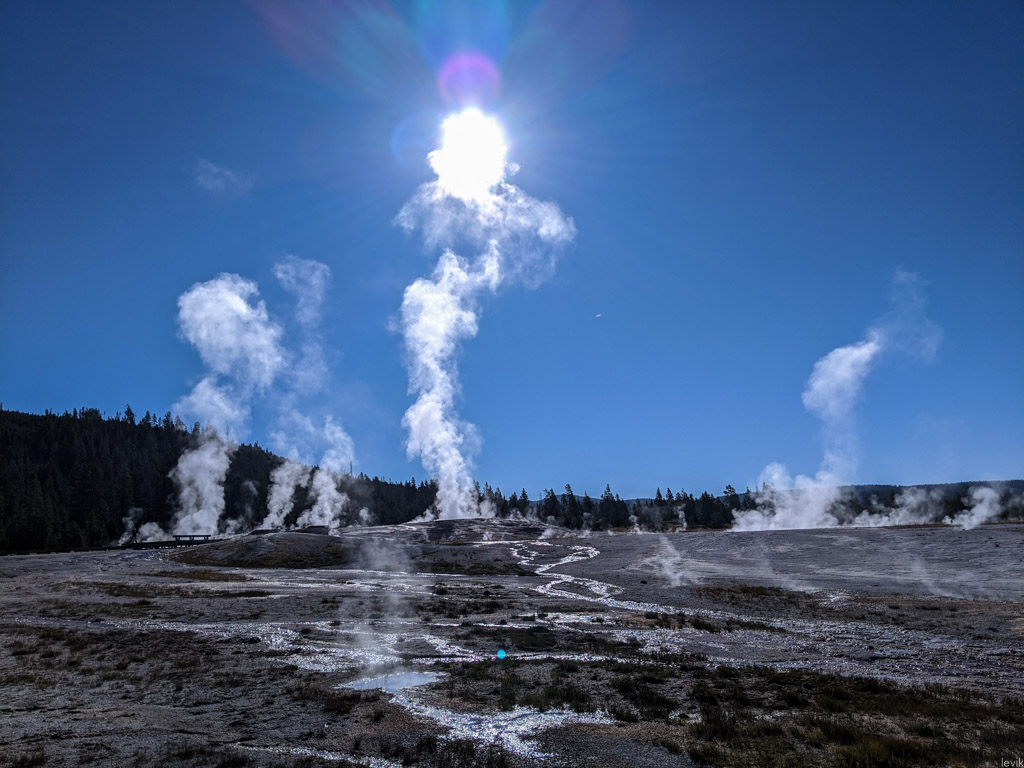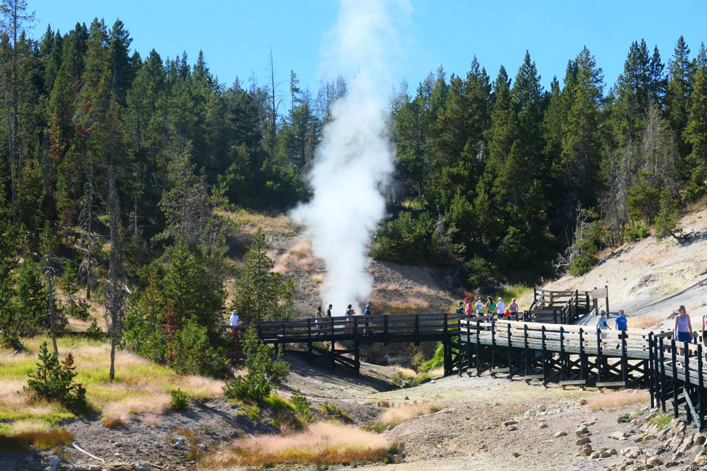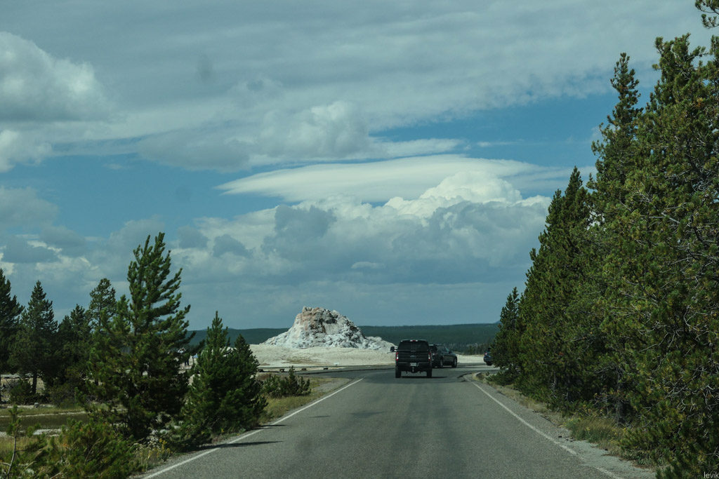 36. Мы на пару таких заехали, и мне лично очень понравилась одна, которая называется Firehole Lake Drive. Это ответвление проходит мимо нескольких очень красивых гейзеров. Один из них (вот этот на фото) даже извергался, пока мы к нему ехали. Но я не успел сфотографировать.