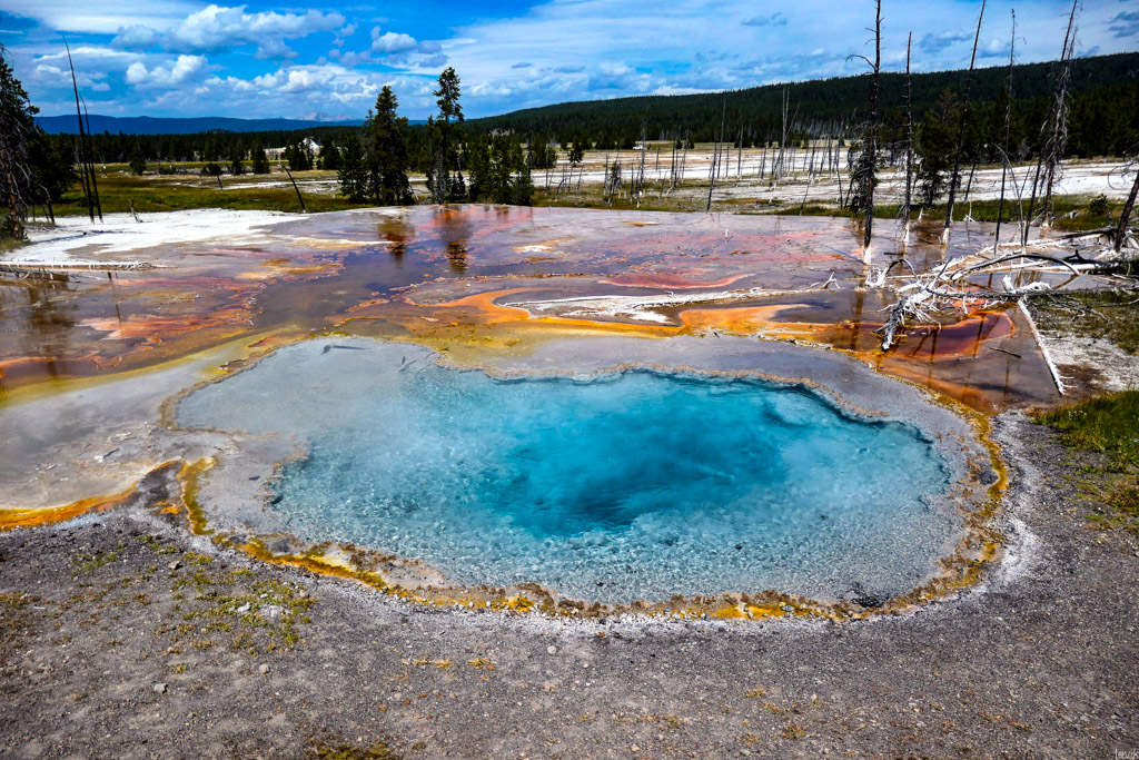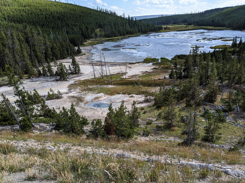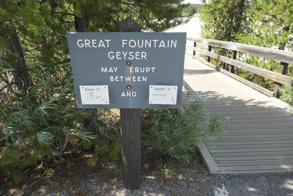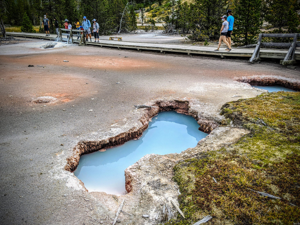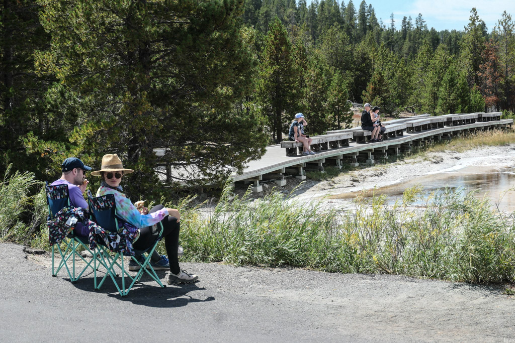 36. Мы на пару таких заехали, и мне лично очень понравилась одна, которая называется Firehole Lake Drive. Это ответвление проходит мимо нескольких очень красивых гейзеров. Один из них (вот этот на фото) даже извергался, пока мы к нему ехали. Но я не успел сфотографировать.