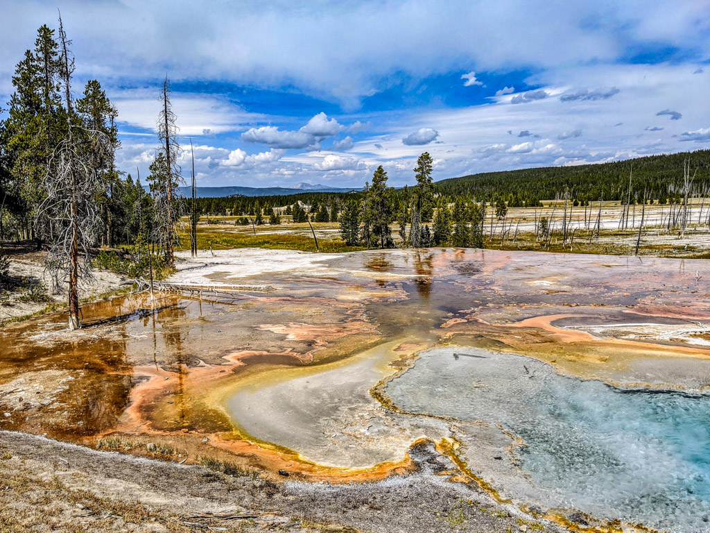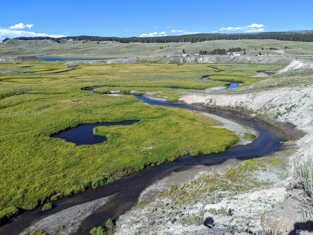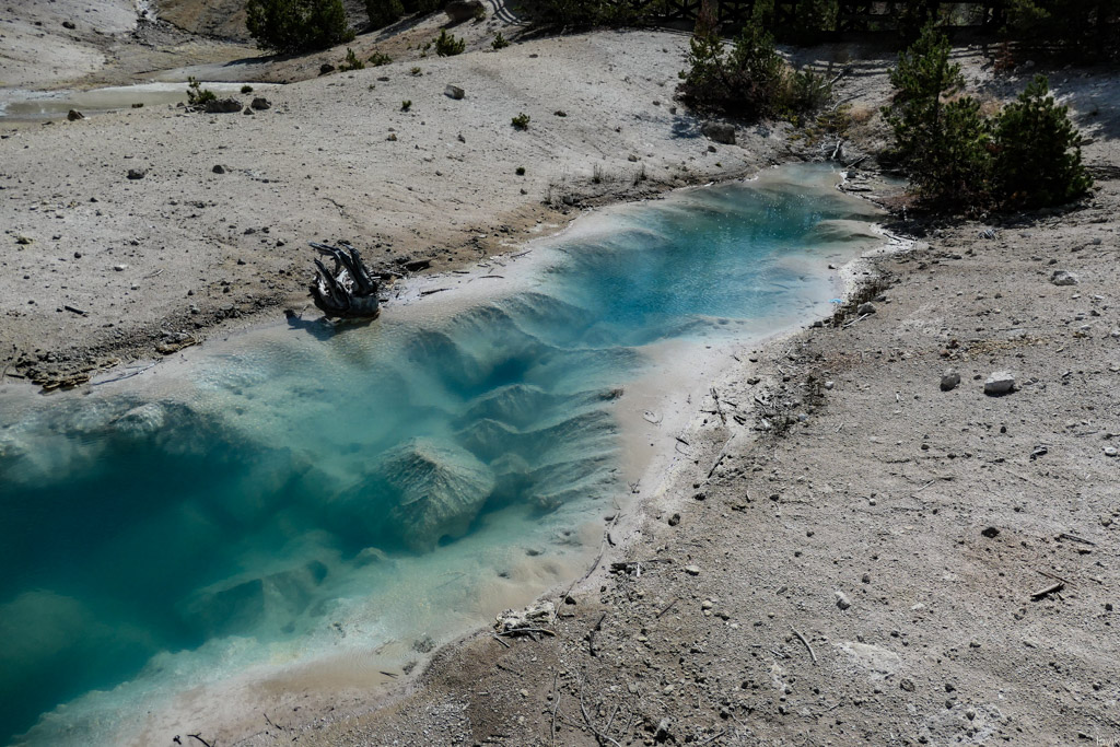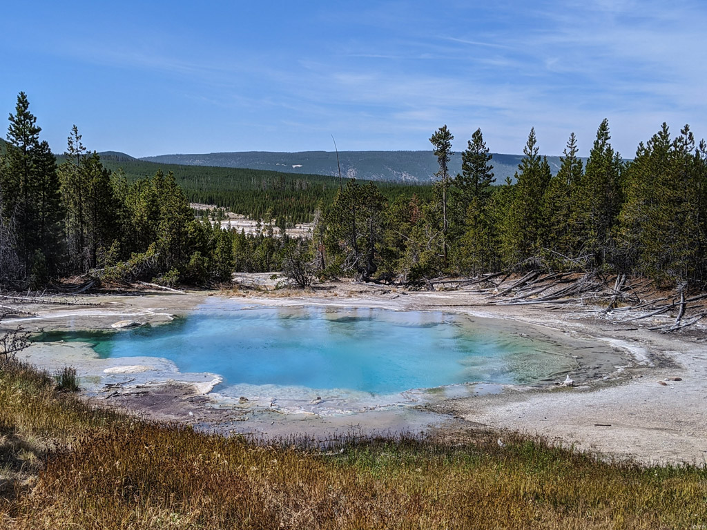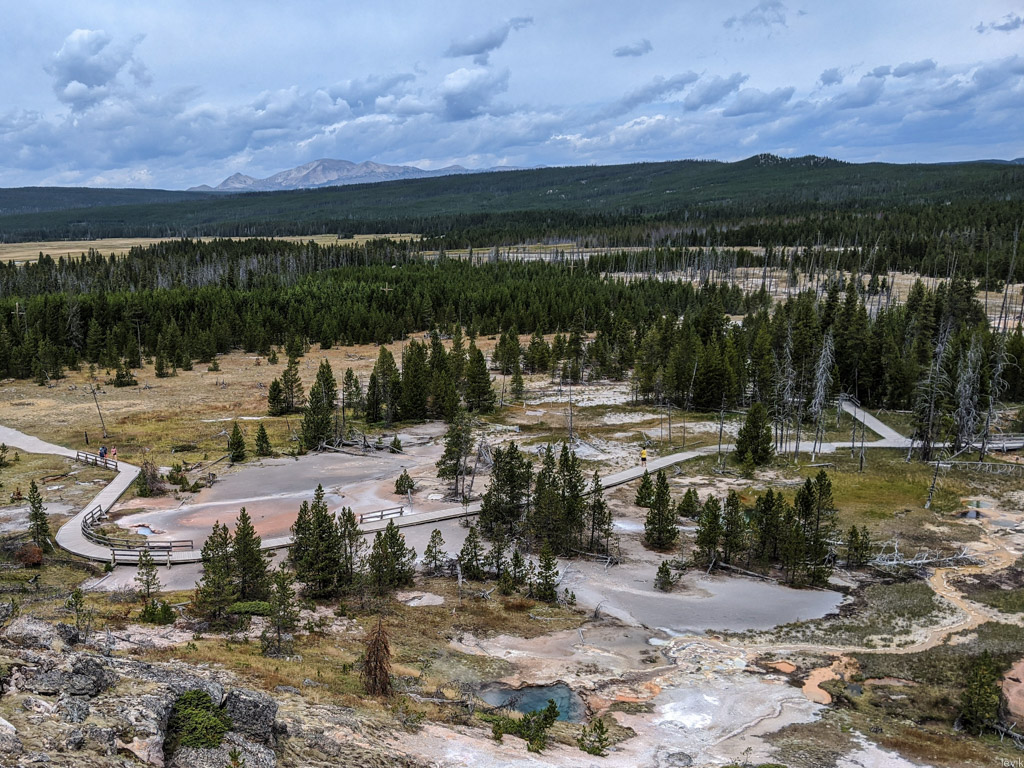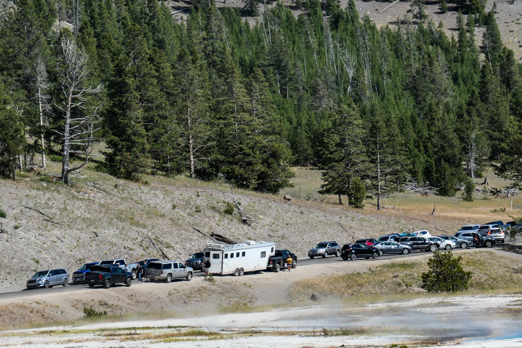 36. Мы на пару таких заехали, и мне лично очень понравилась одна, которая называется Firehole Lake Drive. Это ответвление проходит мимо нескольких очень красивых гейзеров. Один из них (вот этот на фото) даже извергался, пока мы к нему ехали. Но я не успел сфотографировать.