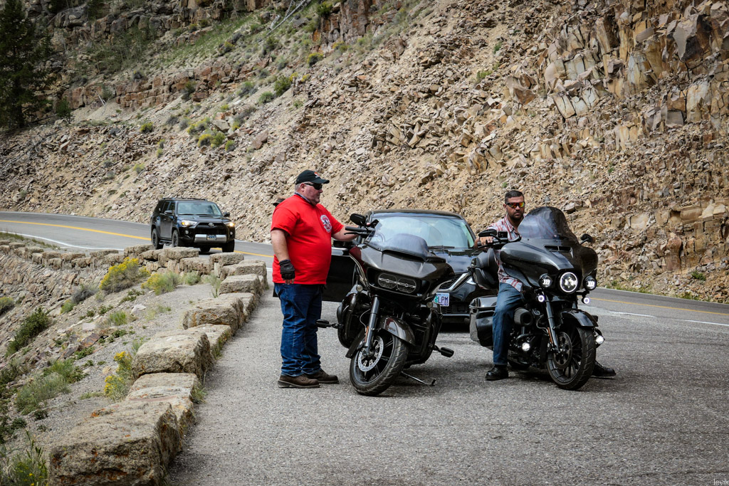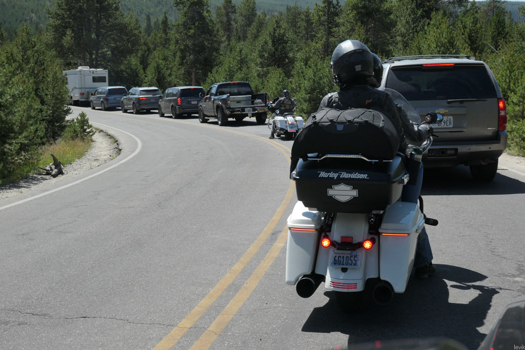 15. А ещё в парк приезжает большое количество байкеров. Это как правило коренастые ребята на коренастых Харлеях, обвешанных баками, сумками и прочей гарнитурой. Спортивных мотоциклов я в Йеллоустоуне почти не видел, а разных чопперов и иже с ними - сколько угодно.