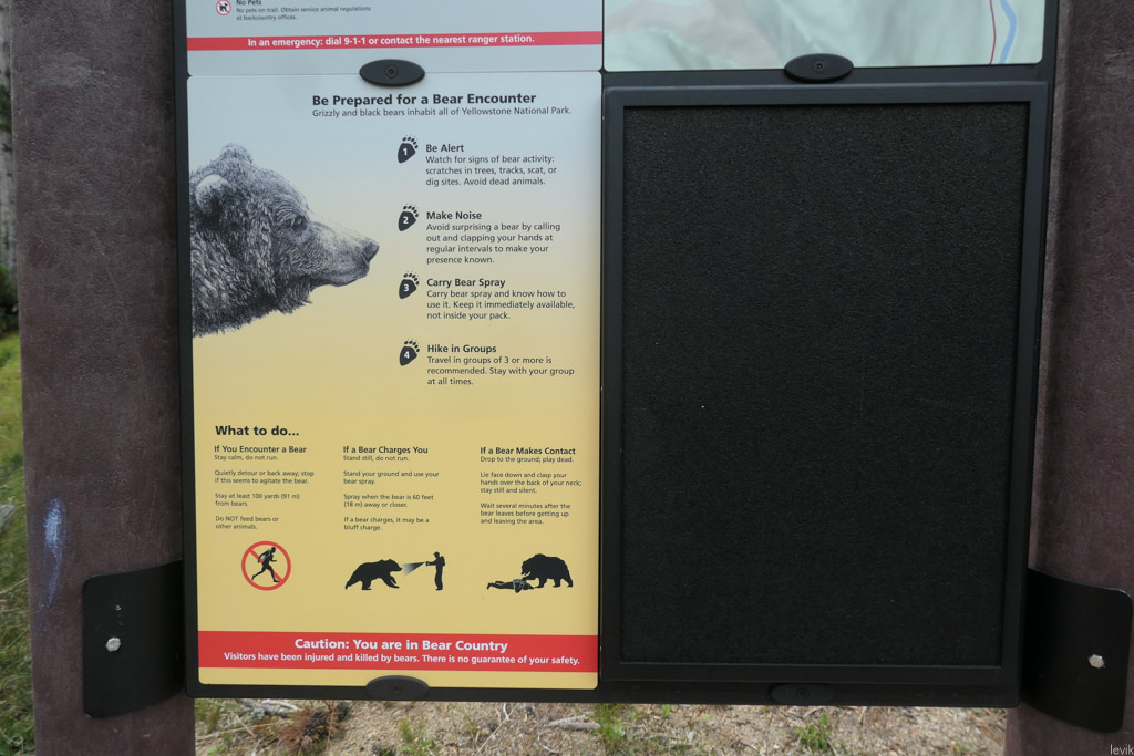 54. У начала таких троп обязательно висят карты, которы можно сфотографировать на телефон, и предупреждения о том, что на тропе можно встретить медведя. Большое количество туристов в Йеллоустоуне носят с собой баллончик противо-медведевого раствора. Мы, зная, что не пойдём в длинные хайки, решили на этот раз такой не покупать.