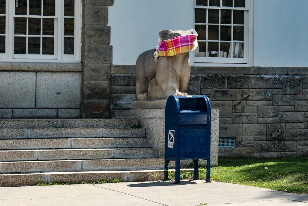 9. Вход на почту охраняют каменные статуи горных львов. Так как мы были тут в разгар эпидемии ковида, у львов на лицах были надеты повязки, как напоминание для туристов всегда ходить в маске в общественных местах.