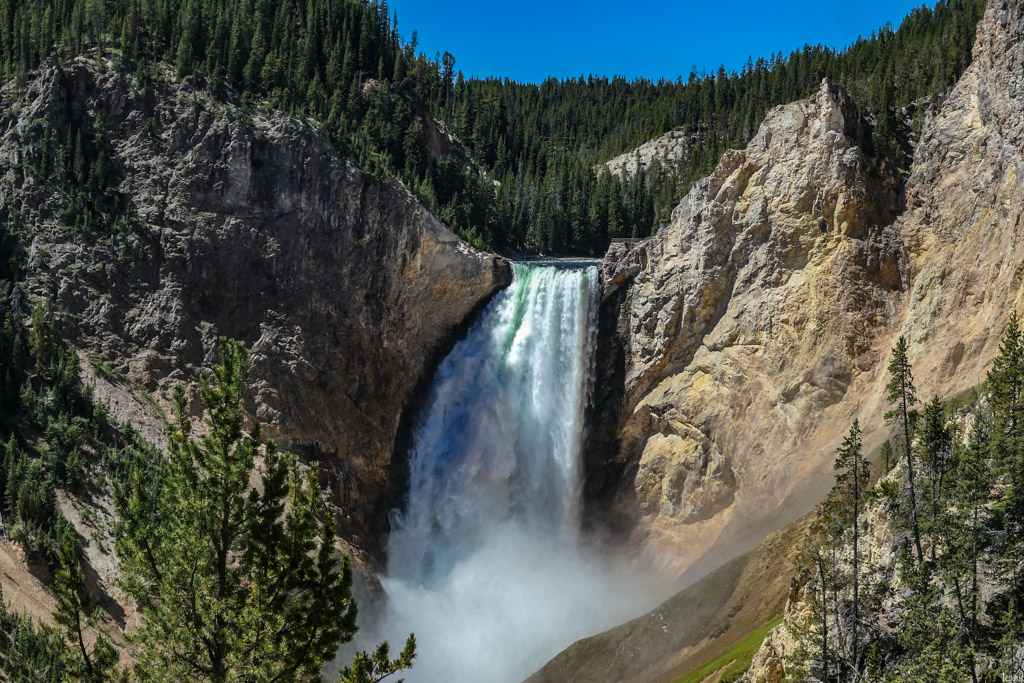 47. Если пройти по тропе вдоль каньона, то вскоре открывается вид на великолепный Нижний Йеллоустуонский водопад - один из трёх, на этой реке. Вода тут гудит, падая вниз почти на 100 метров. Кстати, вокруг видно, что каменная порода этих мест имеет желтоватый оттенок. Именно цвет этих камней дал название всему парку (Yellow stone - "жёлтый камень").