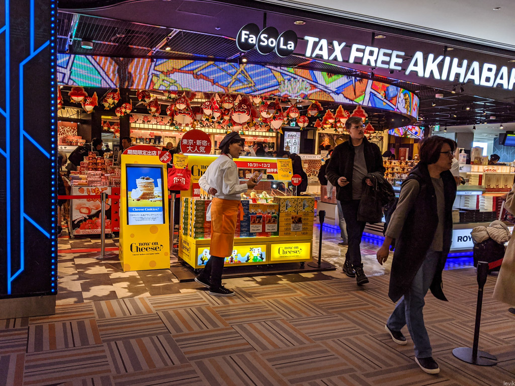 К счастью, в аэропорту Токио знают, что пользуется наибольшим спросом у туристов. Там есть такой Дьюти-Фри, названный в честь самого культового района Токио, и в нём продаётся такое печенье.