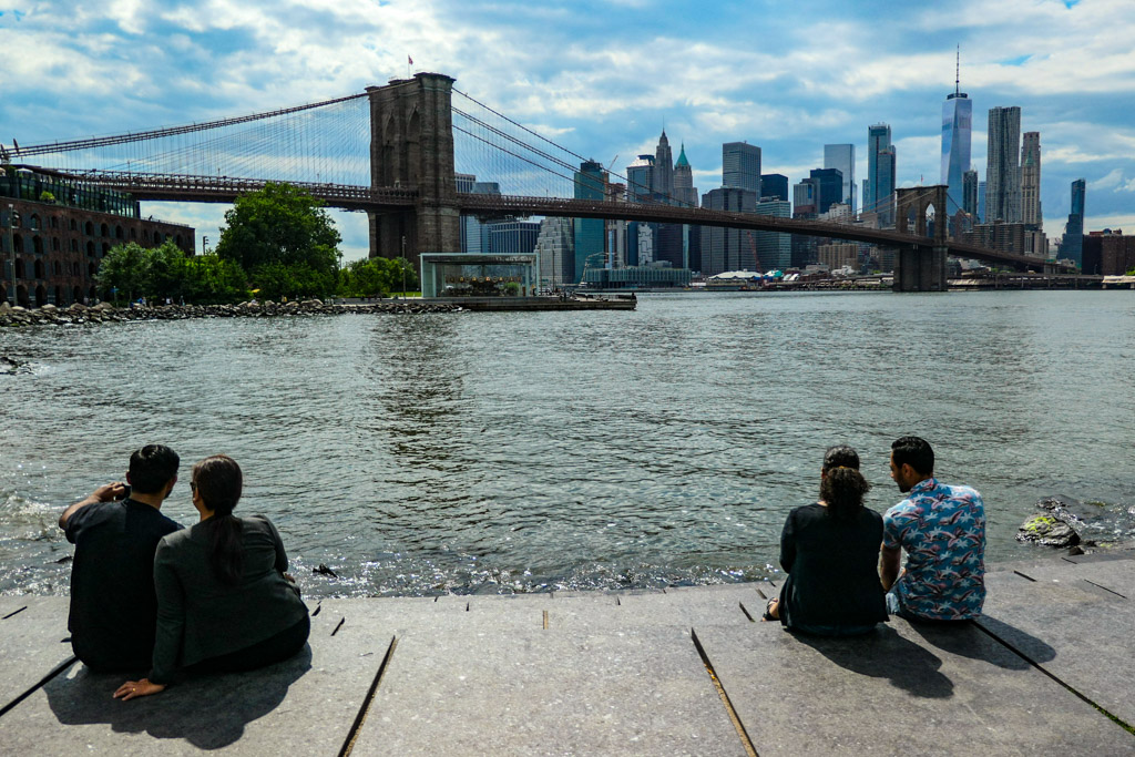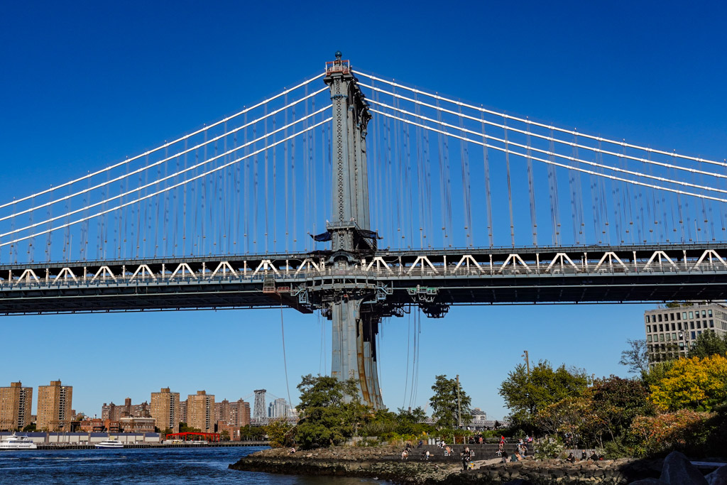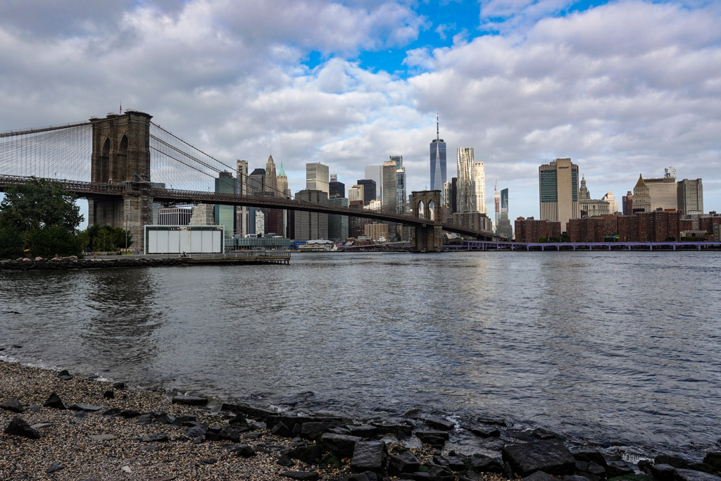 3. Вот он. Сидишь себе у воды, на камнях или на гальке, а перед тобой высится готическая громадина Бруклинского Моста. А за ним небоскрёбы нью-йоркского даунтауна. Когда-то отсюда были отлично видны Башни-Близнецы, а сейчас та самая башня Всемирного Торгового Центра, построенная вместо них. (Это самое высокое здание в Нью Йорке, в США и вообще в целом Западном Полушарии.)