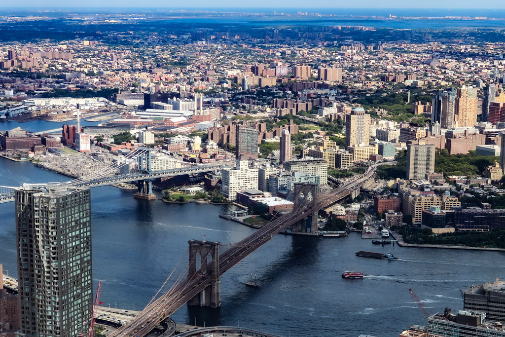 А это вид со смотровой площадки One World Trade Center. Ракурс немного похож на какой-нибудь Сим-Сити, но эти кажущиеся игрушечными с высоты мостики на самом деле огромные проекты городской инфраструктуры, великие достижения человечества для своего времени.
