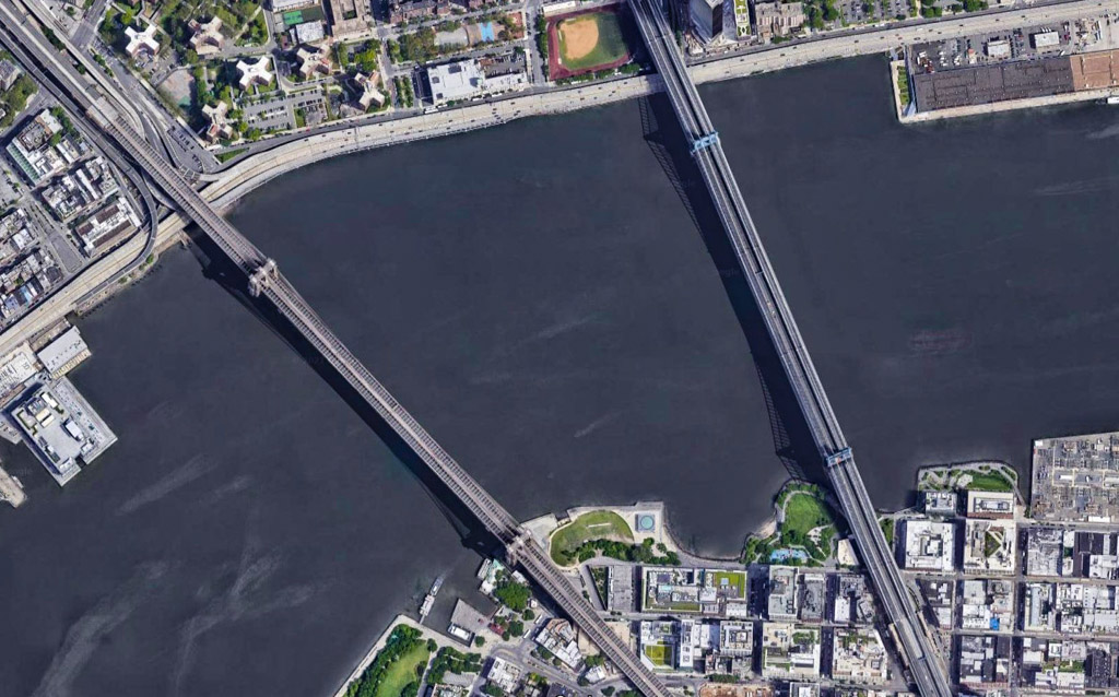 1. Бруклинский (построенный в 1883) и Манхэттенский (1912) мосты расположены ближе друг к другу, чем два любых других моста в городе. А на бруклинском берегу между ними вообще можно пройти пешком минут за пять. У подножия этих мостов находится район, который получил модное название "Дамбо" - не в честь диснеевского слона, а как аббревиатура: "Down Under Manhattan Bridge Overpass", DUMBO. Это один из самых приятных районов города, место, где раньше были фабричные и складские помещения, которые сейчас отреставрировали, и превратили в офисы и дорогое жильё.