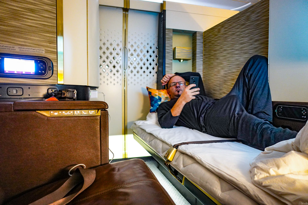 Но если пройти чуть вперёд от бизнес-класса, то вы попали бы в первый класс, который многие энтузиасты считали лучшим во всей индустрии. Авиакомпания называла эти места "Апартаментами" - в каждом была закрывающаяся дверь, широкое откидывающееся кресло, и отдельная кровать. Более того, пассажирам первого класса можно было принять душ прямо во время полёта!