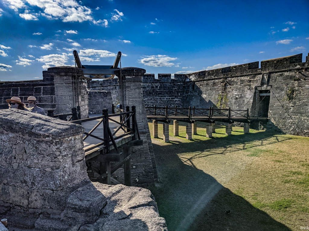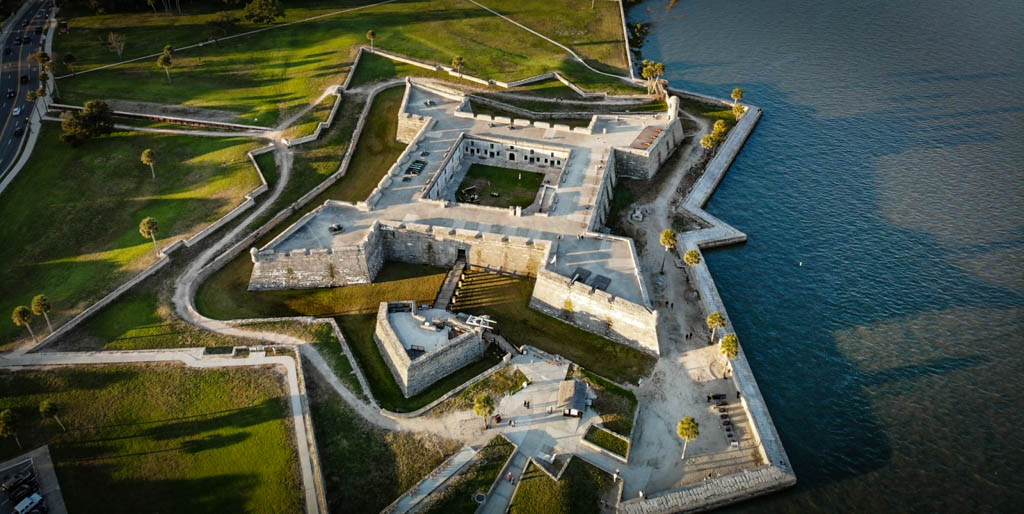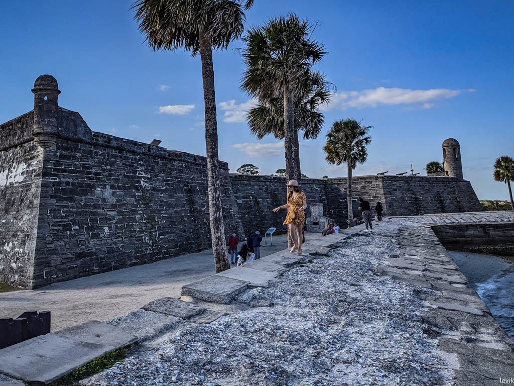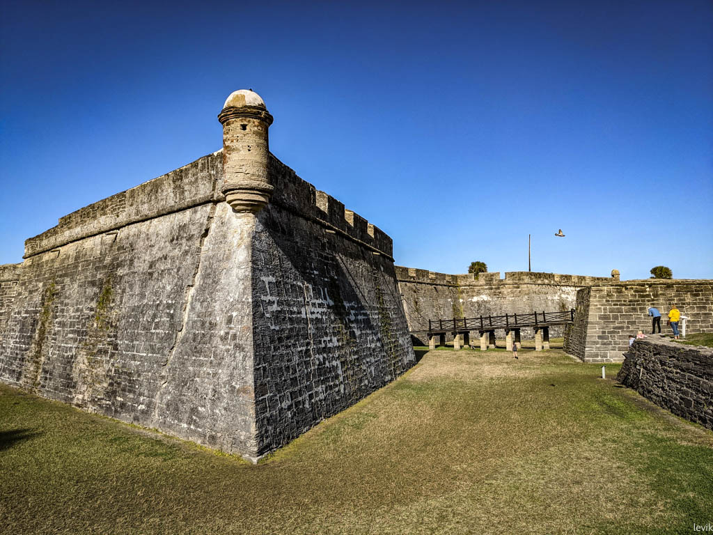 Тогда, чтоб лучше защитить колонию, испанцы построили тут каменную крепость: Castillo de San Marcos, Крепость Святого Марка. Она была сооружена в классическом для эпохи пушек стиле "звёздочки". Стены специально располагались под такими углами, чтоб максимально усложнить противнику перпендикулярный огонь.