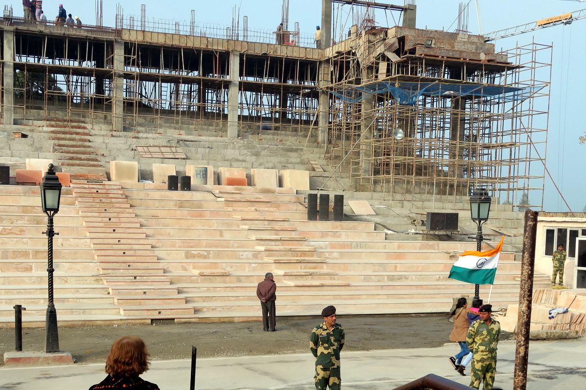 Желающих посмотреть эту ежедневную церемонию так много, что власти строят новые трибуны. Вообще настроение тут как на спортивном матче - люди приходят поболеть за свою страну, как будто в этой церемонии можно выиграть. (На самом деле нельзя.) На индийской стороне громко играет патриотическая музыка - колонки замолкают очень редко.