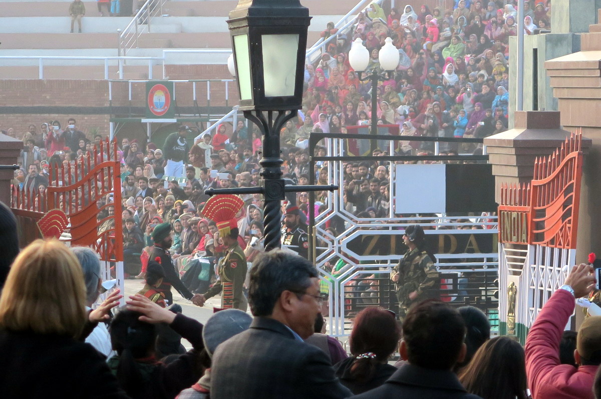 Как я уже сказал, границу закрывают в два часа, чтоб подготовиться к этой церемонии. Церемония состоит в основном из марширования, во время которых воротана замке закрыты. Там с каждой стороны свои ворота конечно, у индийцев открываются вовнутрь страны, а у пакистанцев просто разъезжаются в стороны, как двери метро. И вот через сколько-то минут марширования, обе стороны одновременно эти ворота распахивают настежь! "Болельщики" с обеих сторон взрываются аплодисментами и улюлюканьем.