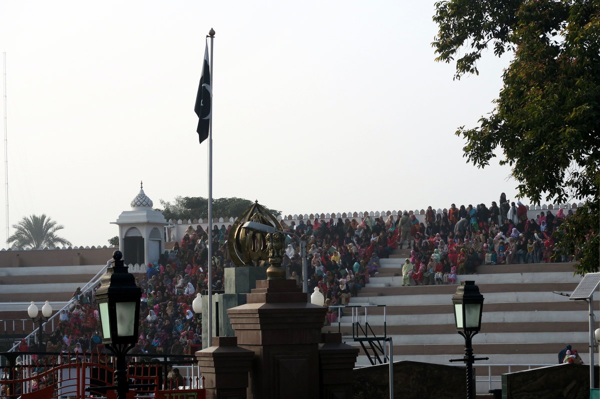 Зато когда они на секундочку делают перерыв между песнями, доносятся звуки мусульманской музыки с другой стороны. Обе страны играют громко, чтоб перекричать друг-друга. Нехорошо, если твои болельщики услышат вдруг заграничную музыку посреди прилива патриотизма. Прямо за забором видны трибуны на пакистанской стороне. Там у них тоже какое-то хитрое разделение, но люди сидят полукругом, может им оттуда лучше видно происходящее, чем нам. Нам вот например ворота видно не очень хорошо.