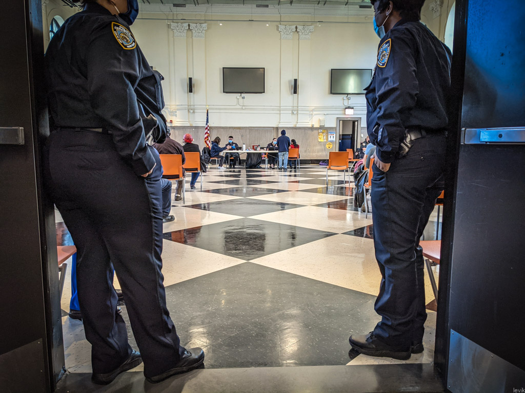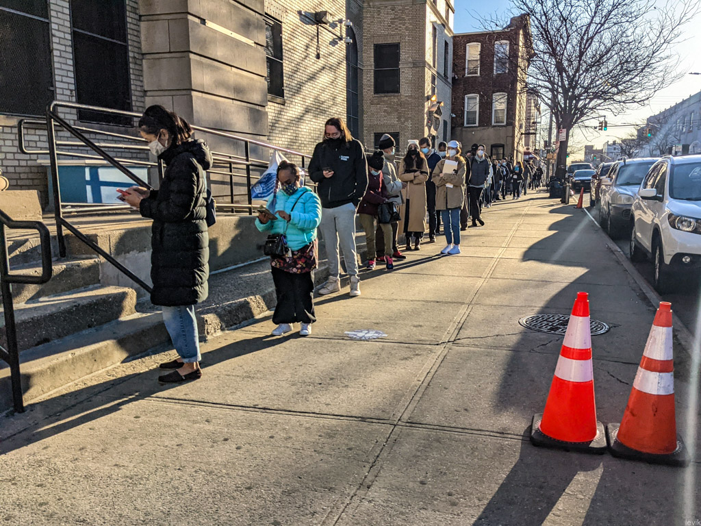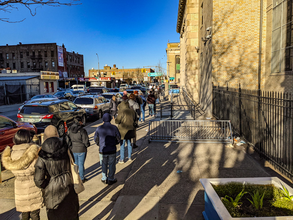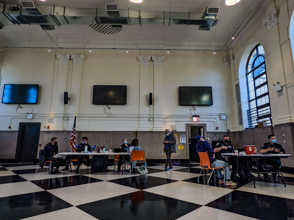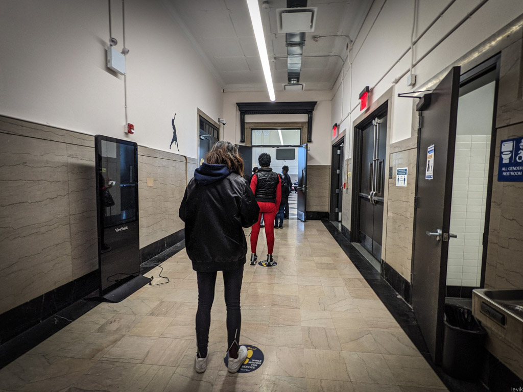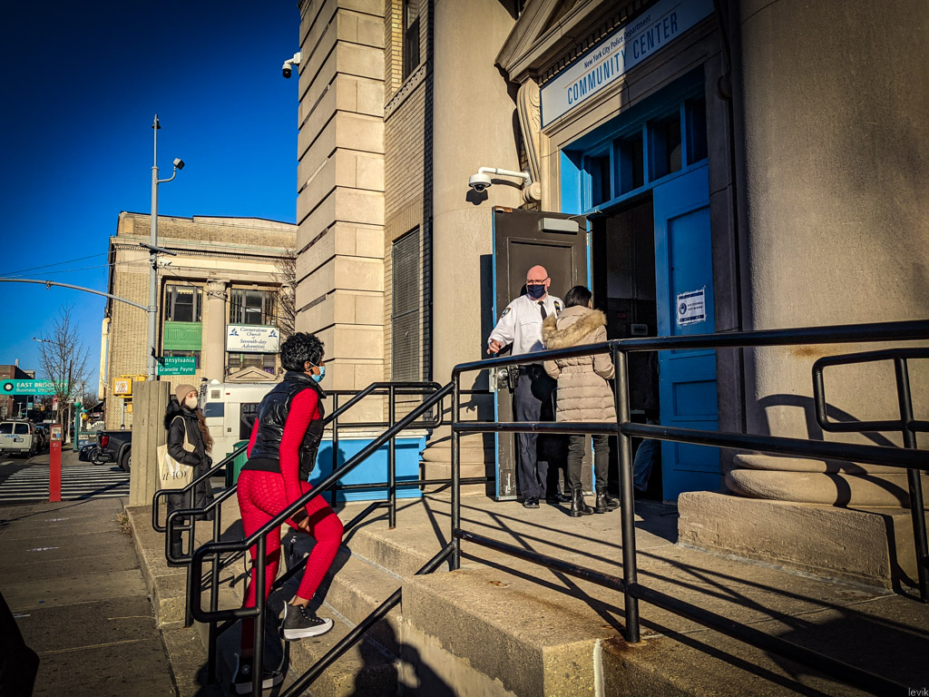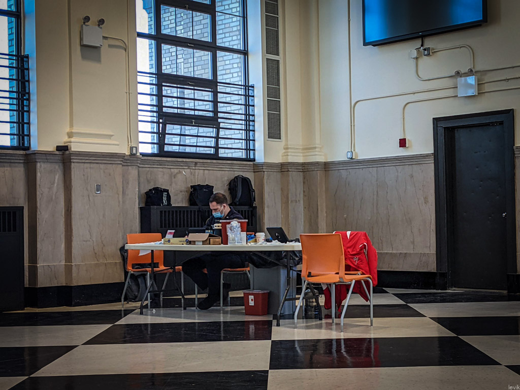 8. Здесь образовалась ещё одна небольшая очередь. Девушки с компьютерами проверяли у всех бумажки и удостоверения, находили людей в системе, так что никто с улицы зайти не мог. Однако, никаких других подтверждений не спрашивали - то есть, если ты наврал, что работаешь медиком, то тебя могли бы привить не проверяя, даже если ты моложе нужного возраста. Я вообще заметил, что у нас в Нью Йорке всякие такие коронавирусные правила не очень энфорсят, оставляют на честное слово.