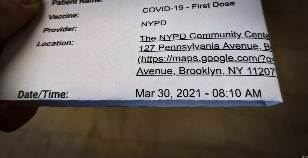 То есть, вот вы перезагрузили страничку - БАЦ! - появился слот. Но если вы долго нажимали на него, и потом замешкались проверить в какой он день, то его успеет отхватить кто-нибудь более ловкий и решительный. Так что я сидел, перезагружал страничку на протяжении получаса, пока не выудил свободное окошко в приемлемом для меня месте: общественном центре NYPD, где-то в получасе езды от моего дома. А то, что время мне выпало ровно через 10 минут после того, как моей возрастной категории открывали вакцинацию - лишь красивое совпадение (или... НЕТ?!!!)