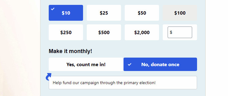 Даже я, который в 2020 году решил каждый месяц жертвовать на политику по $100, её не отмечал: хотел сам каждый месяц решать, кому пойдут мои деньги. Вот как выглядит такая галочка при оформлении доната кандидату-Демократу: