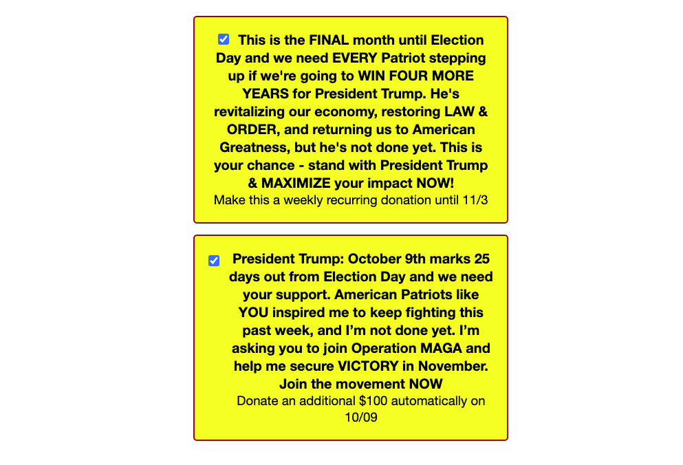 К октябрю, когда президент сильно отставал по всем опросам, и продолжал собирать меньше денег, чем свой оппонент, было принято решение ещё немного "поднажать" на сторонников. Первую галочку, которая делала пожертвования ежемесячными, превратили в "еженедельную". А объяснение того, что эти галочки делают изменили так, чтоб было трудней его понять. Жирным текстом написаны обще-политические призывы, и лишь последняя строчка перед каждой галочкой объясняет, её истинную суть: