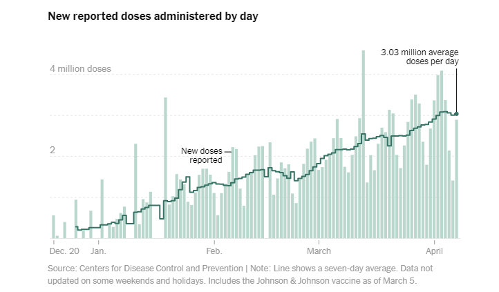 Темп вакцинации в Америке продолжает расти. Если в феврале мы вышли на средний уровень миллиона доз в день, то месяц назад доросли до двух миллионов, а за последнюю неделю - и до трёх! Вступая в должность Байден обещал, что за первые сто дней его администрации будет сделано сто миллионов уколов - эту отметку мы достигли на 59й день с его инаугурации, и он решил свой план удвоить: теперь стоит цель 200 миллионов уколов за первые сто дней (они истекут 30 апреля).