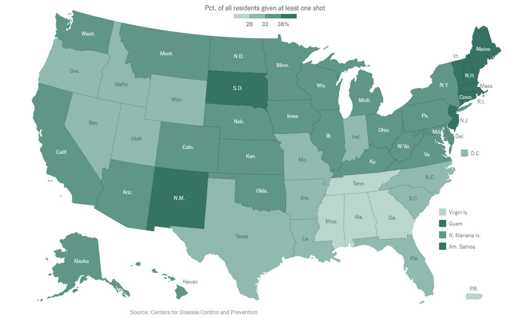 Надо заметить, что не все штаты одинаково эффективно развернули вакцинацию. Несмотря на то, что федеральный центр закупает и поставляет вакцины, и пытается координировать работу, выпуская общие руководства для штатов, непосредственно прививки остаются в ведении губернаторов. И по карте видно, что лучше всех с задачей справляются штаты Новой Англии (на северо-востоке страны), Южная Дакота и Нью-Мексико, а хуже всех - штаты юго-востока. Например, в Миссисипи первую дозу получили всего 26% населения, тогда как в Нью-Гемпшире в полтора раза больше, аж 43%!