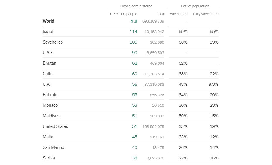 Однако, если пересчитать на душу населения, то картина всё ещё не такая красивая: тут США находится лишь на десятом месте, позади таких лидеров как Израиль, Бутан и Бахрейн. В Израиле вот, к примеру, уже больше половины населения полностью вакцинированы. Интересно, как с этим дела у палестинцев...