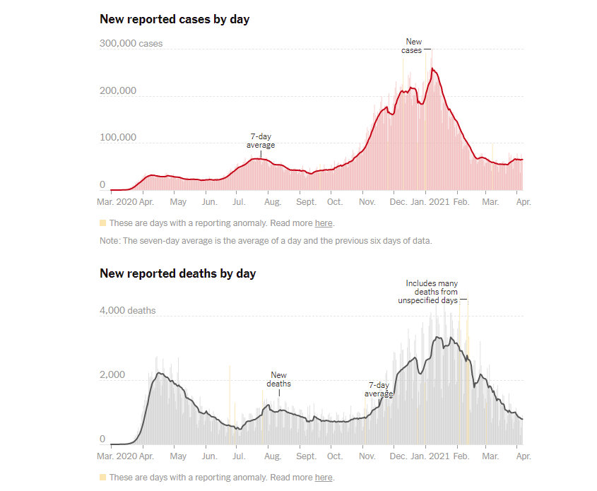 По умершим ситуация немного лучше - их число продолжает падать, даже при выровнявшейся заражаемости. Если в январе у нас были дни, когда в стране умирало по 4,000 человек, то сейчас среднее число смертей упало ниже 800. Будем надеяться, что по мере того, как прививки продолжаются, этот показатель продолжит своё падение. Нам тут есть к чему стремиться: на данный момент количество умирающих каждый день американцев всё ещё выше минимумов достигнутых прошлым летом (меньше 500) и осенью (700).