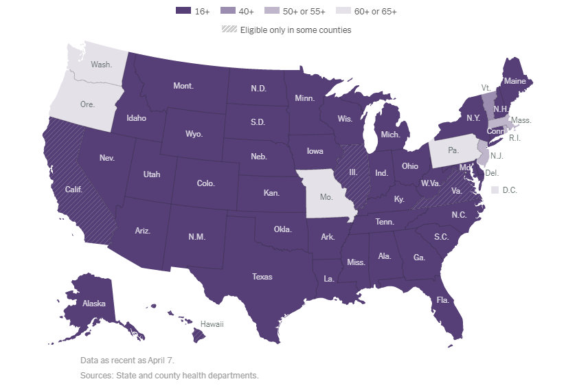 Штаты постепенно открывают вакцинацию для всего взрослого населения. Если ещё месяц назад прививки были разрешены только людям преклонного возраста, и тем, кто находится в группе риска (либо по состоянию здоровья, либо по роду деятельности), то сегодня большинство штатов готовы прививать всех, кому за 16 лет - на этой карте они заштрихованы фиолетовым: