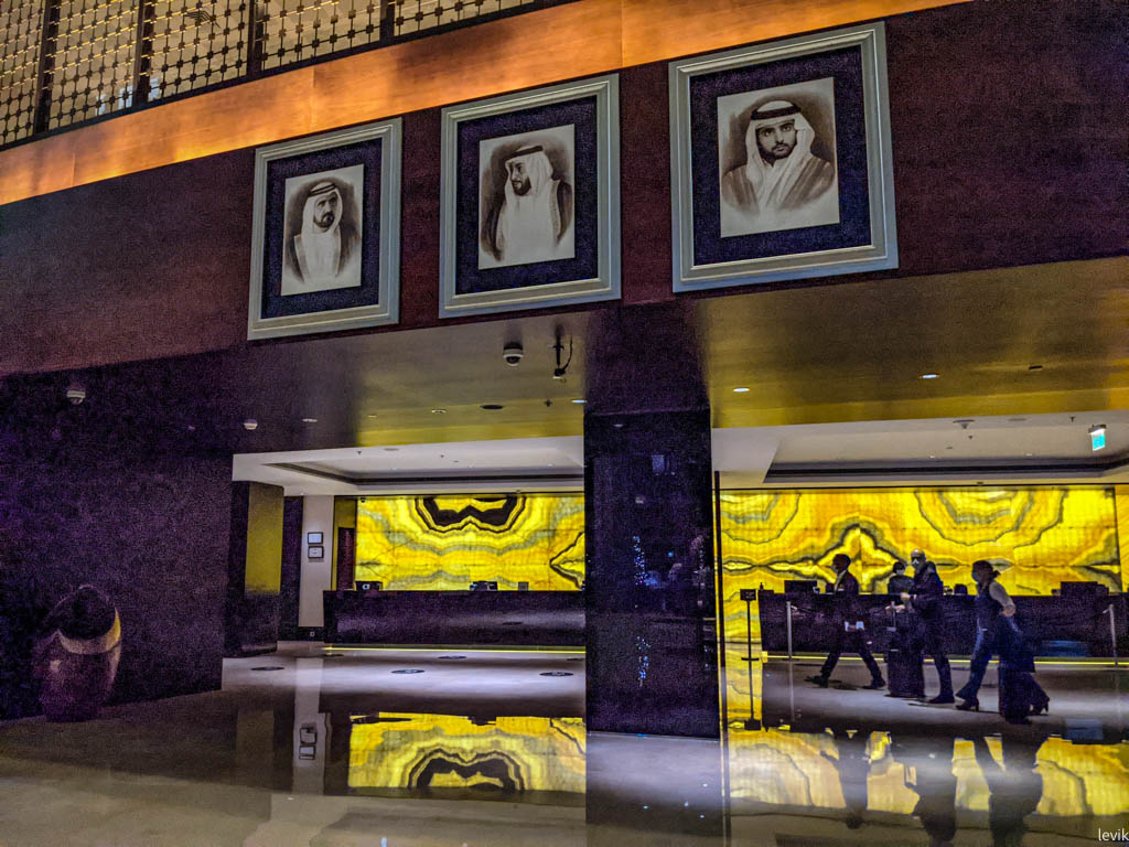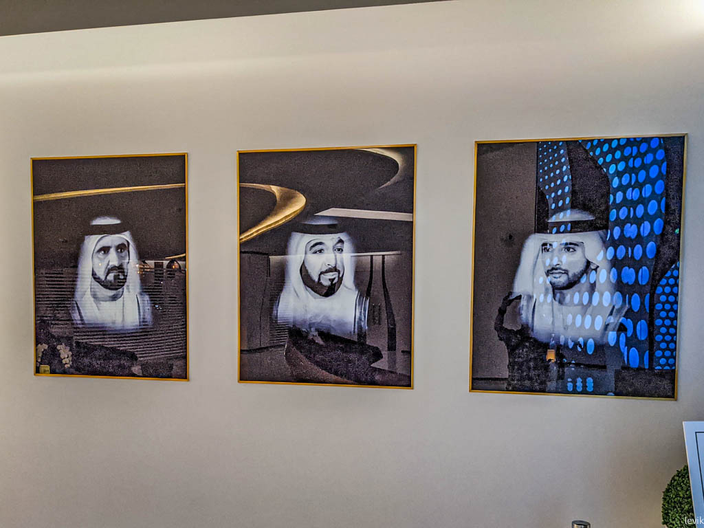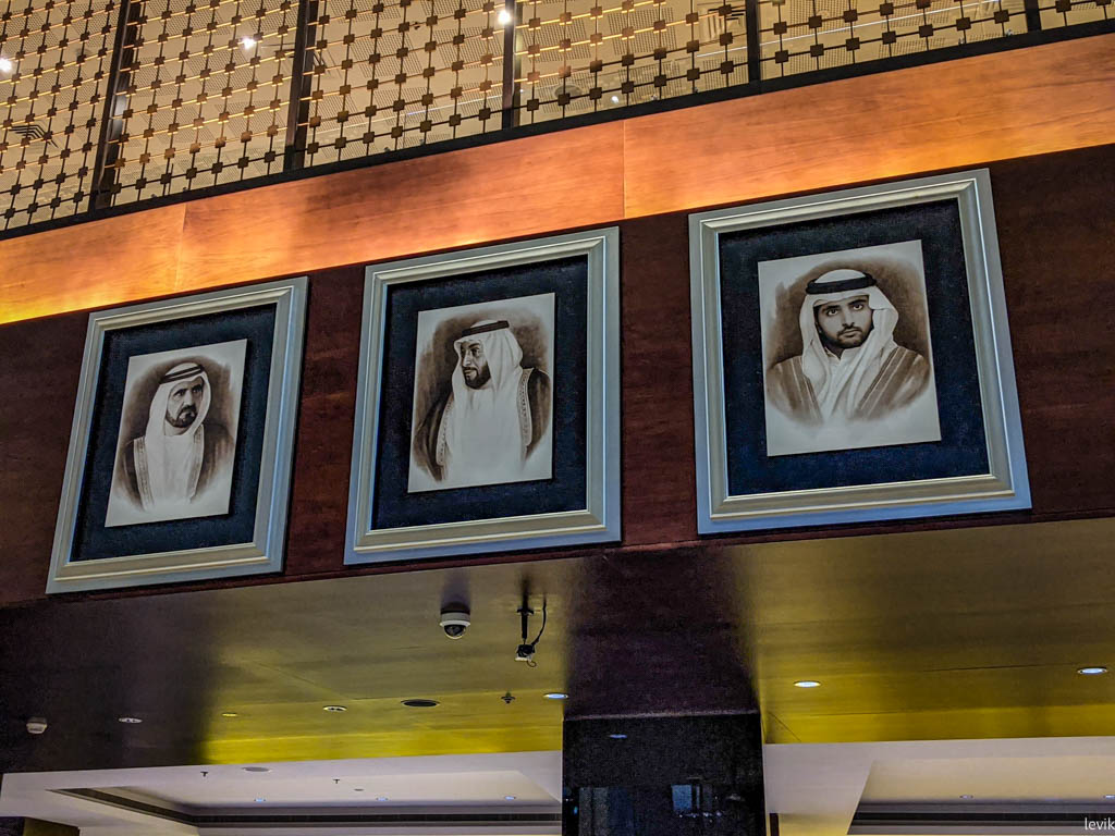 Да, благодаря несколько необычной для XXI века системе правления в Объединённых Арабских Эмиратах, в каждом отеле, в каждом ресторане и в других бизнесах тоже, обязательно висят портреты трёх великих лидеров. (Признаюсь, я не знаю, действительно ли это обязательно по закону, или все просто добровольно их вывешивают, но так или иначе, эти три портрета повсюду.)