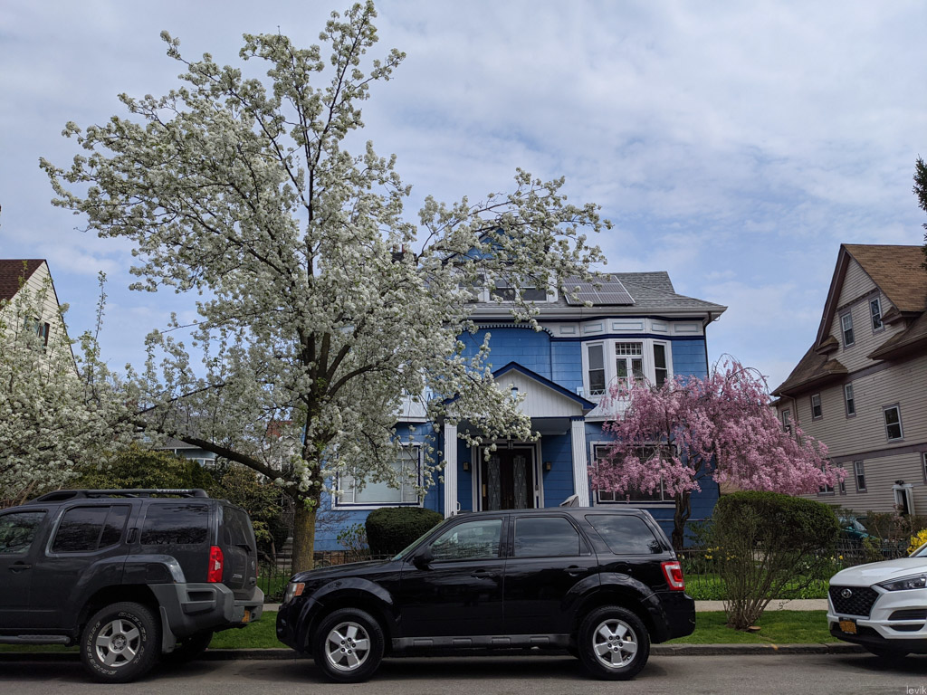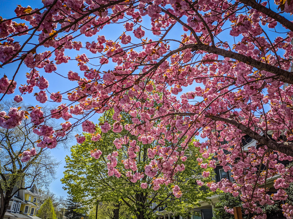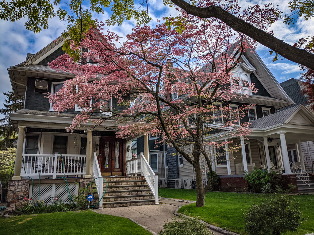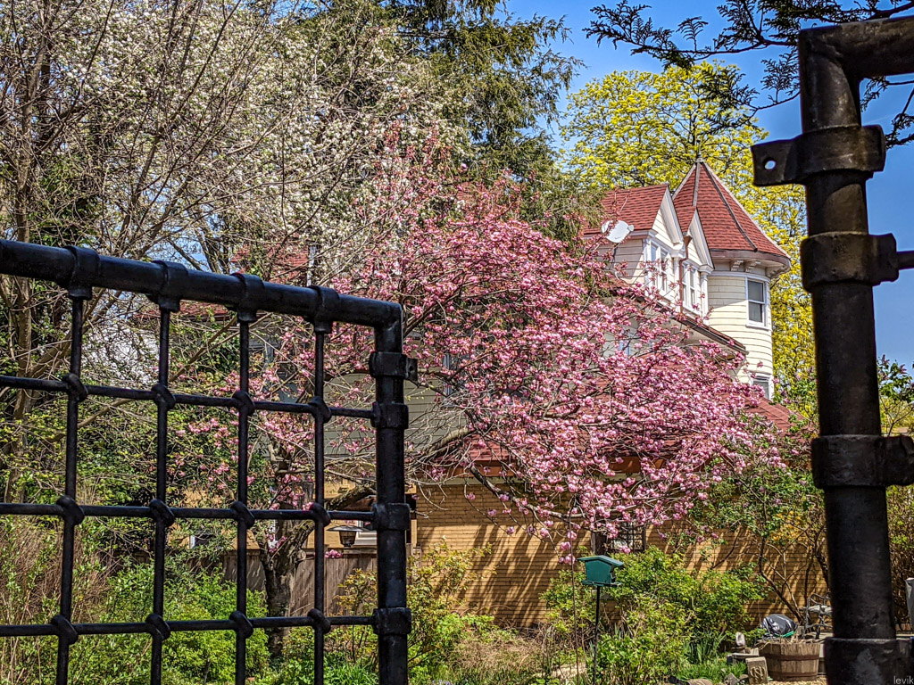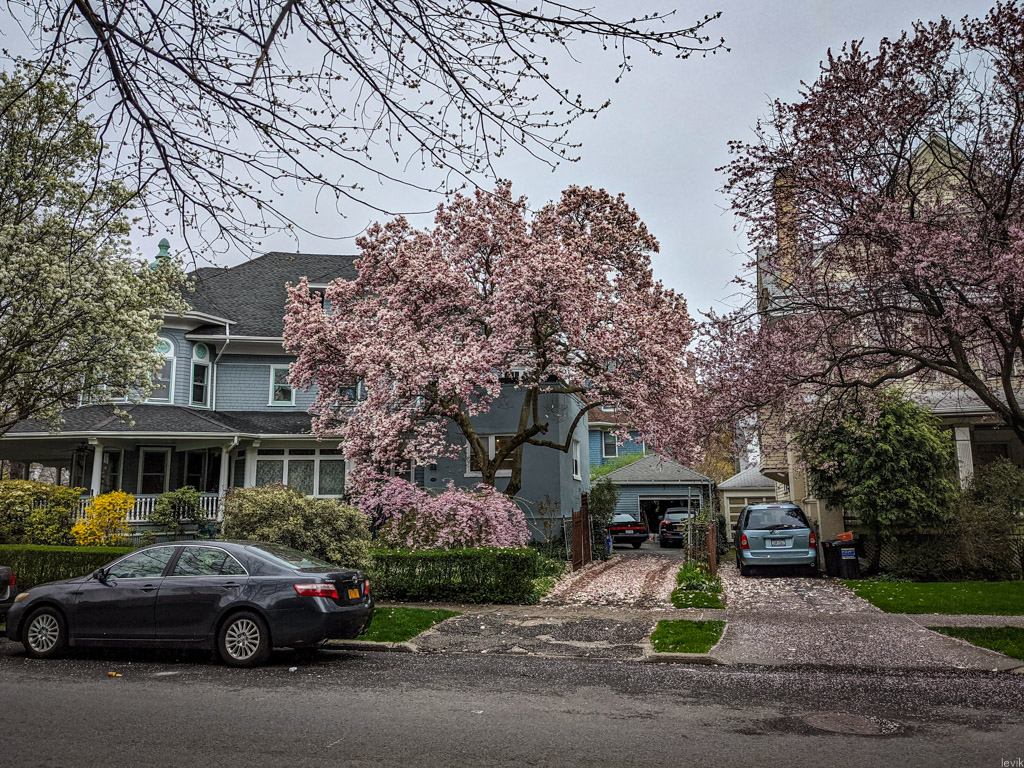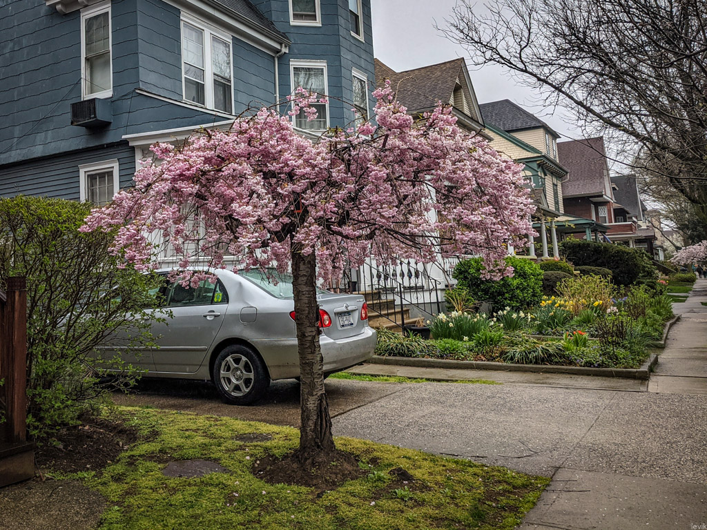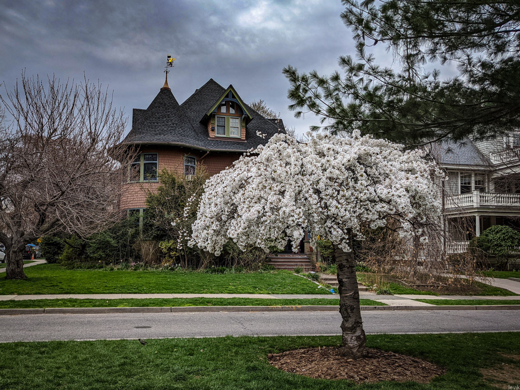 1. Кстати, я ведь уже рассказывал вам о том, что мои соседи - владельцы частных "викторианских" домиков, построенных в самом начале ХХ века. Все они с башенками, колоннами, большими террасами, и т.д. Но сегодня главное, что перед ними стоят газоны, где хозяева высаживают деревья на свой вкус. И сейчас, весной, эти деревья великолепно цветут.