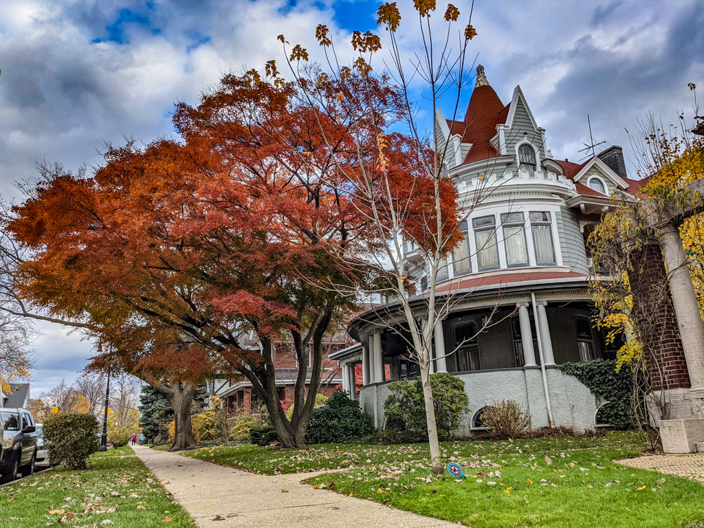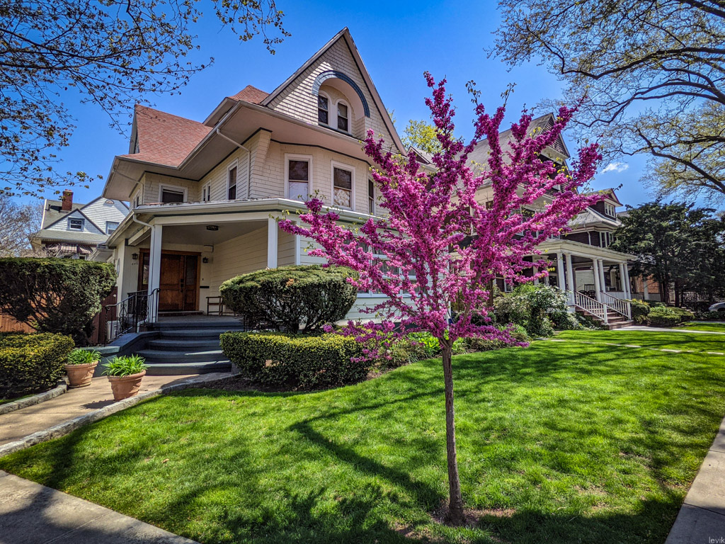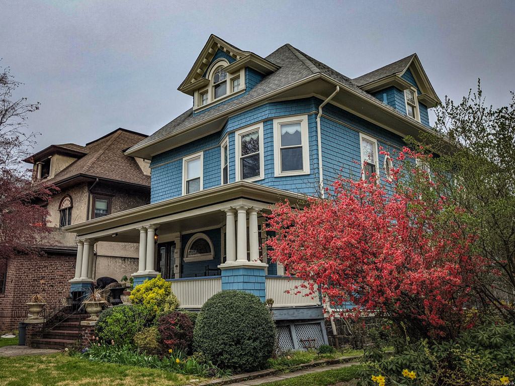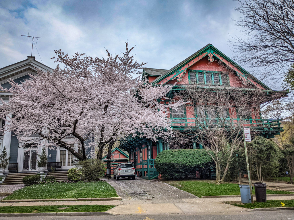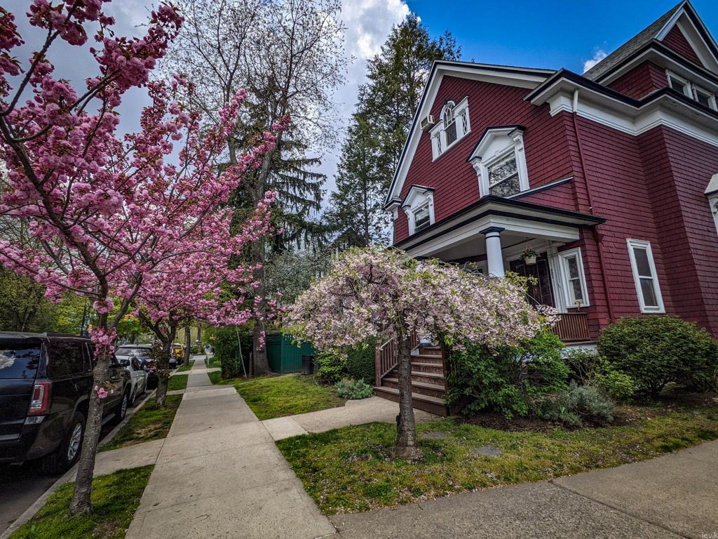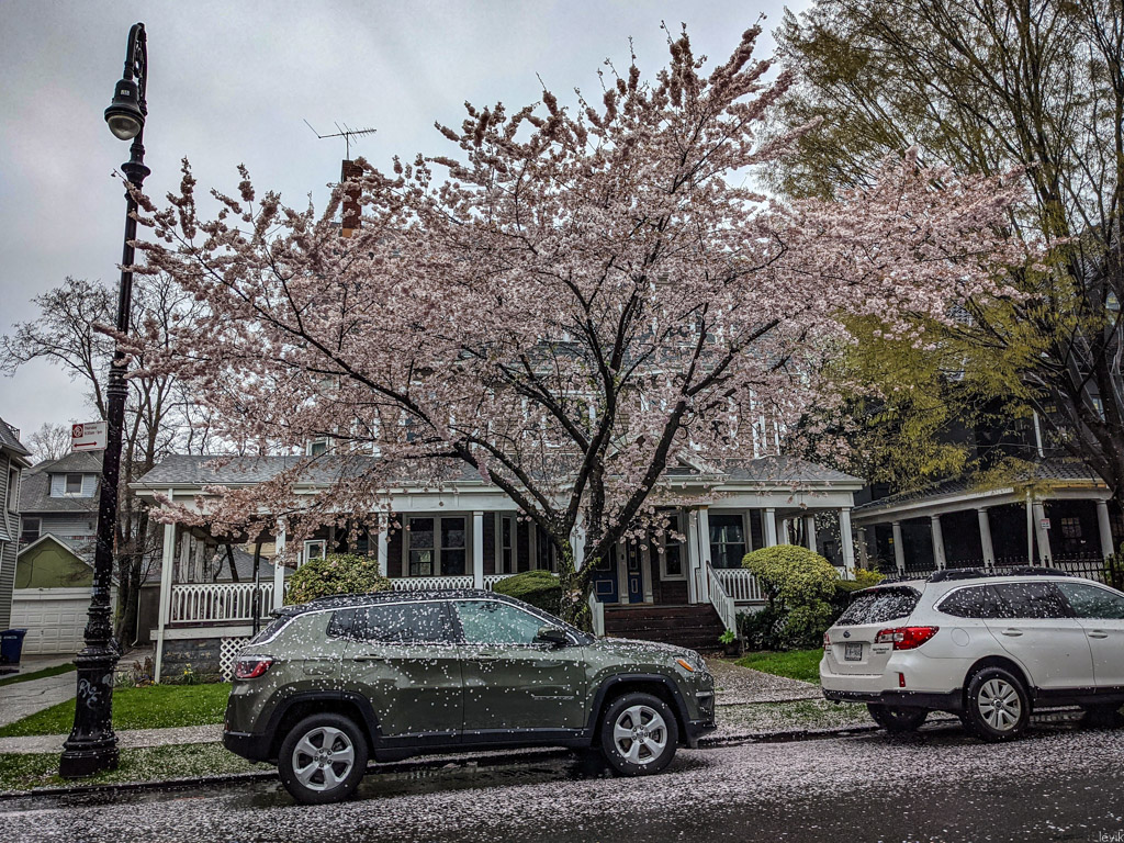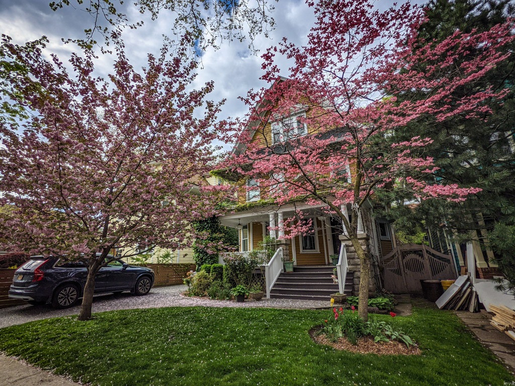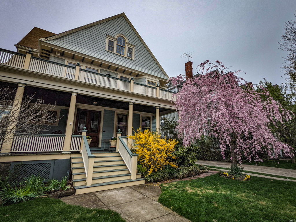 1. Кстати, я ведь уже рассказывал вам о том, что мои соседи - владельцы частных "викторианских" домиков, построенных в самом начале ХХ века. Все они с башенками, колоннами, большими террасами, и т.д. Но сегодня главное, что перед ними стоят газоны, где хозяева высаживают деревья на свой вкус. И сейчас, весной, эти деревья великолепно цветут.