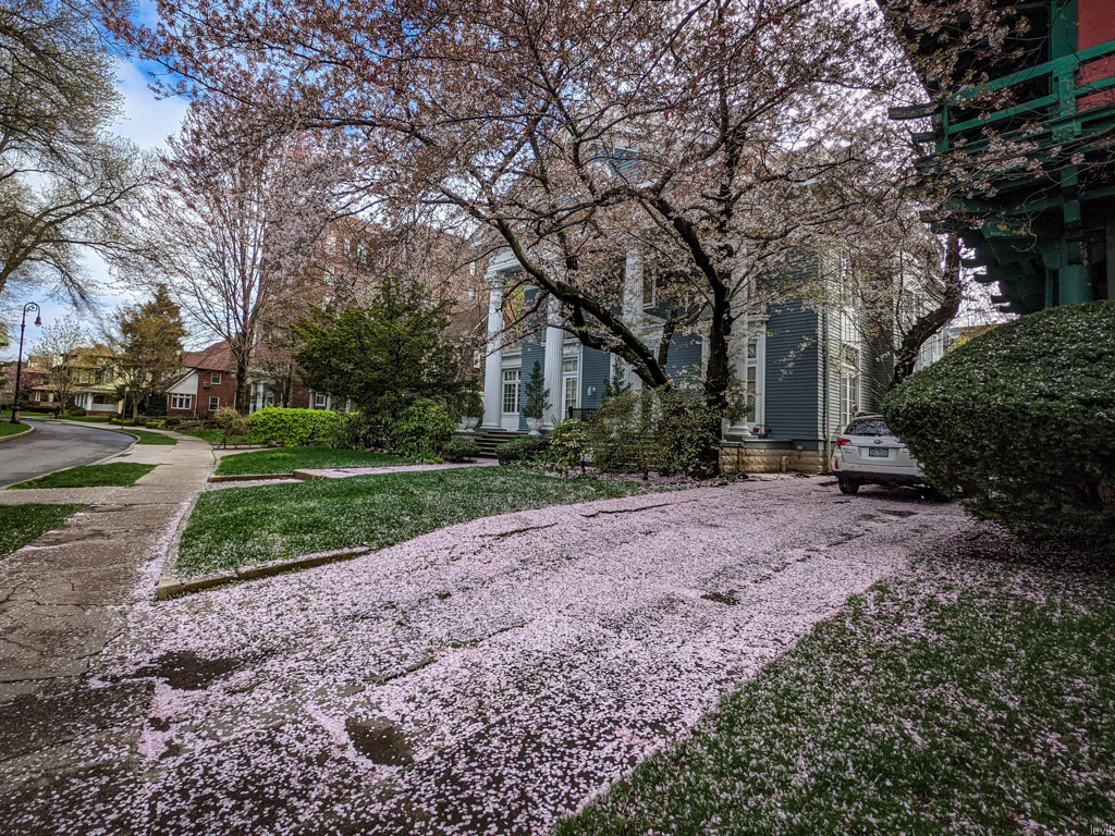 10. Где-то через неделю после предыдущей фотографии вернулся на то же место, и увидел, что все цветы с веток опали, создавая характерный ковёр из лепестков на земле.