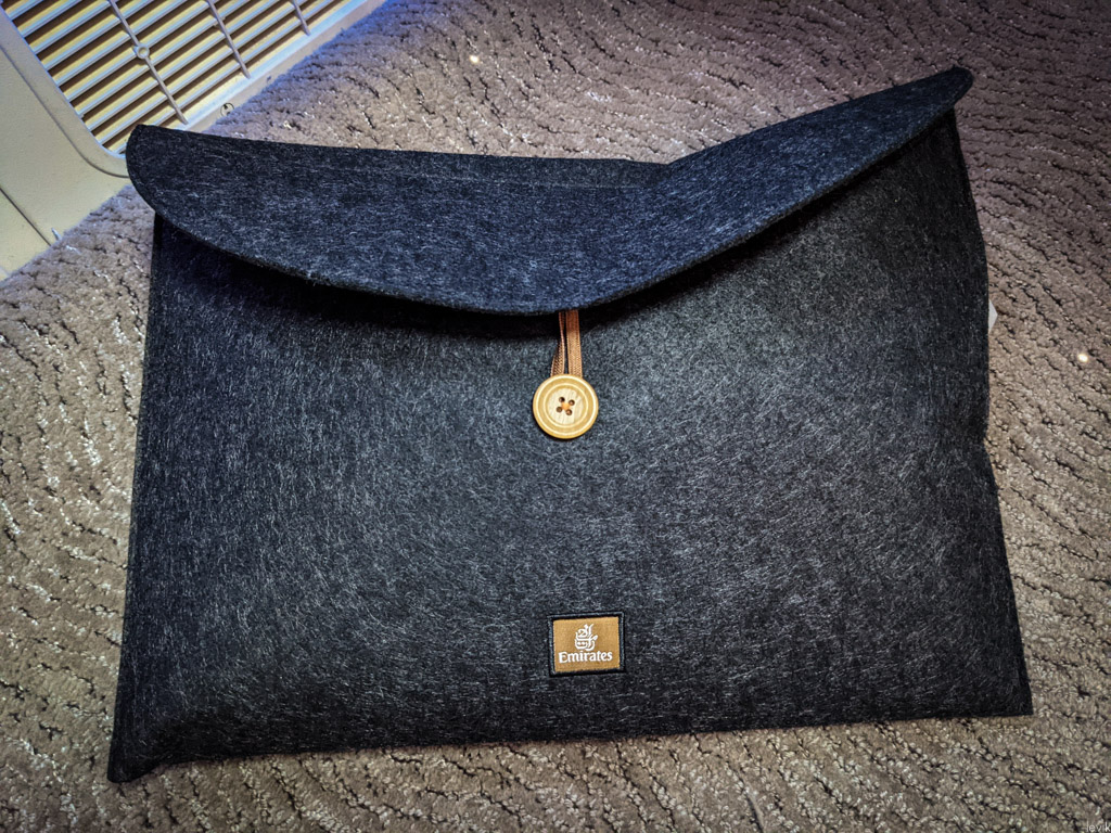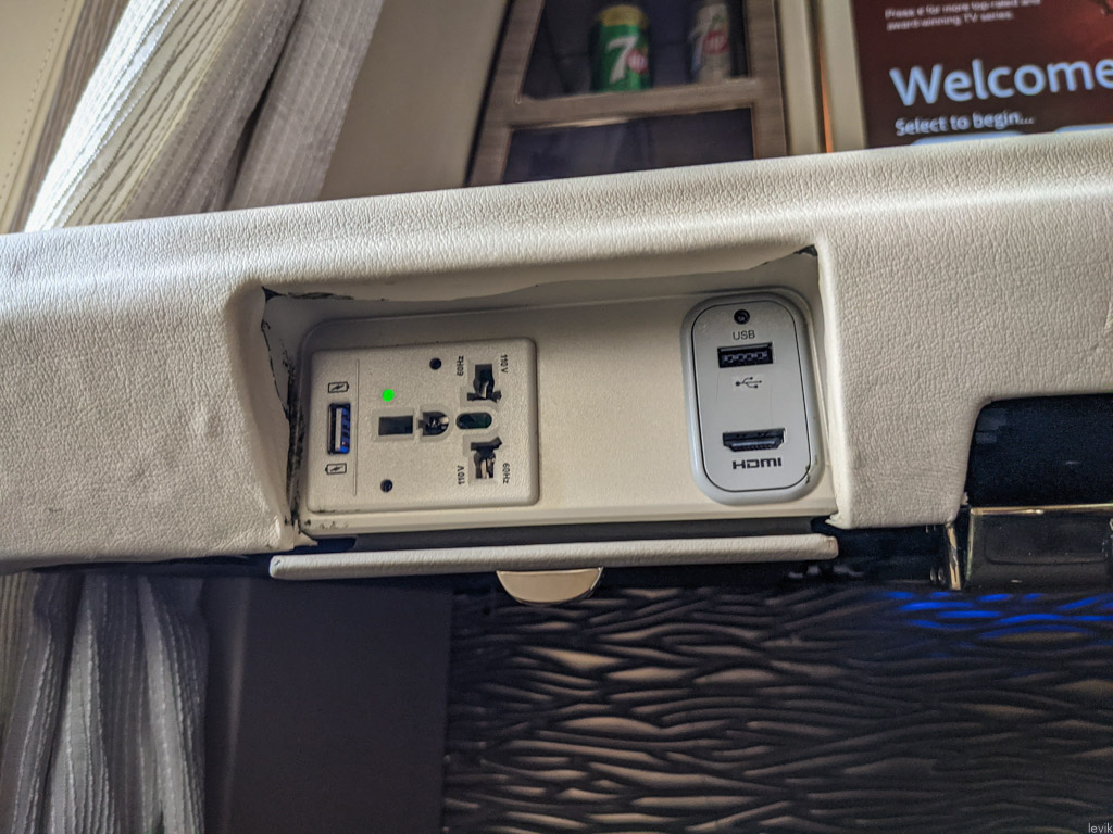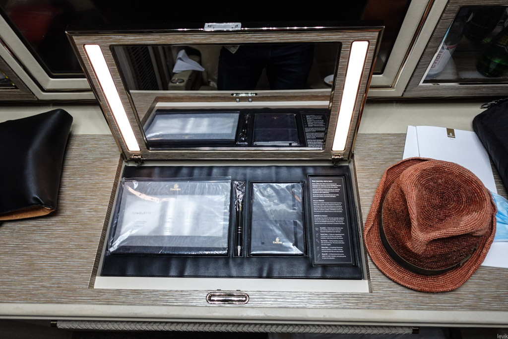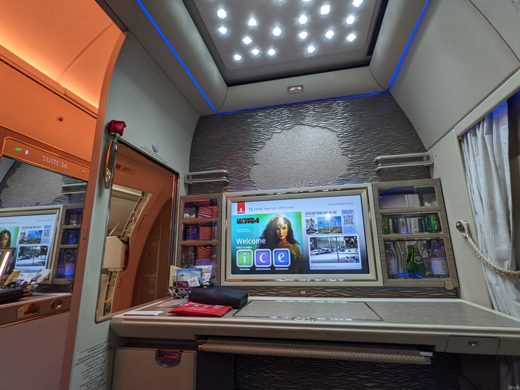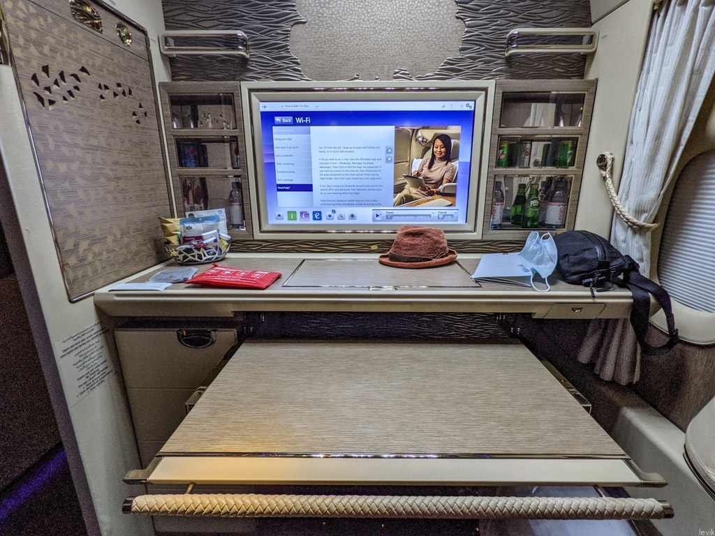 Под большим экраном зафиксирована крупная полка, на которой пассажира ждут всячески жизненно необходимые для перелёта в первом классе вещи.