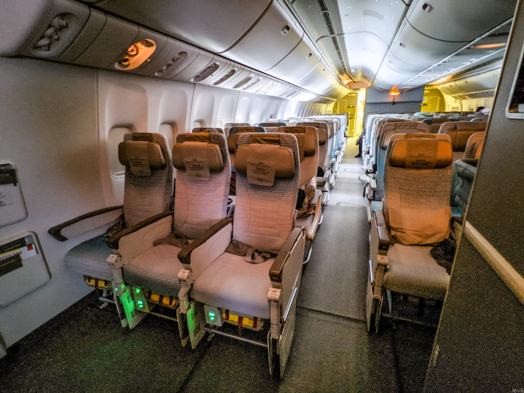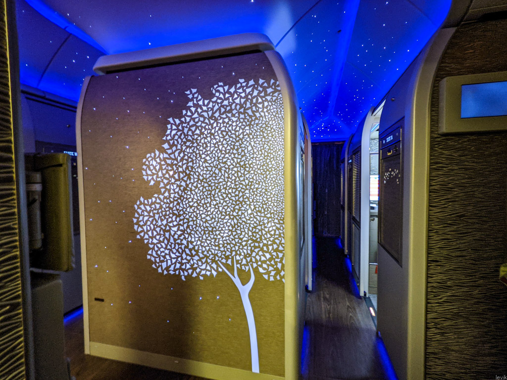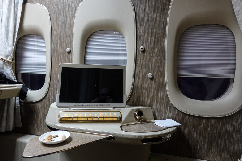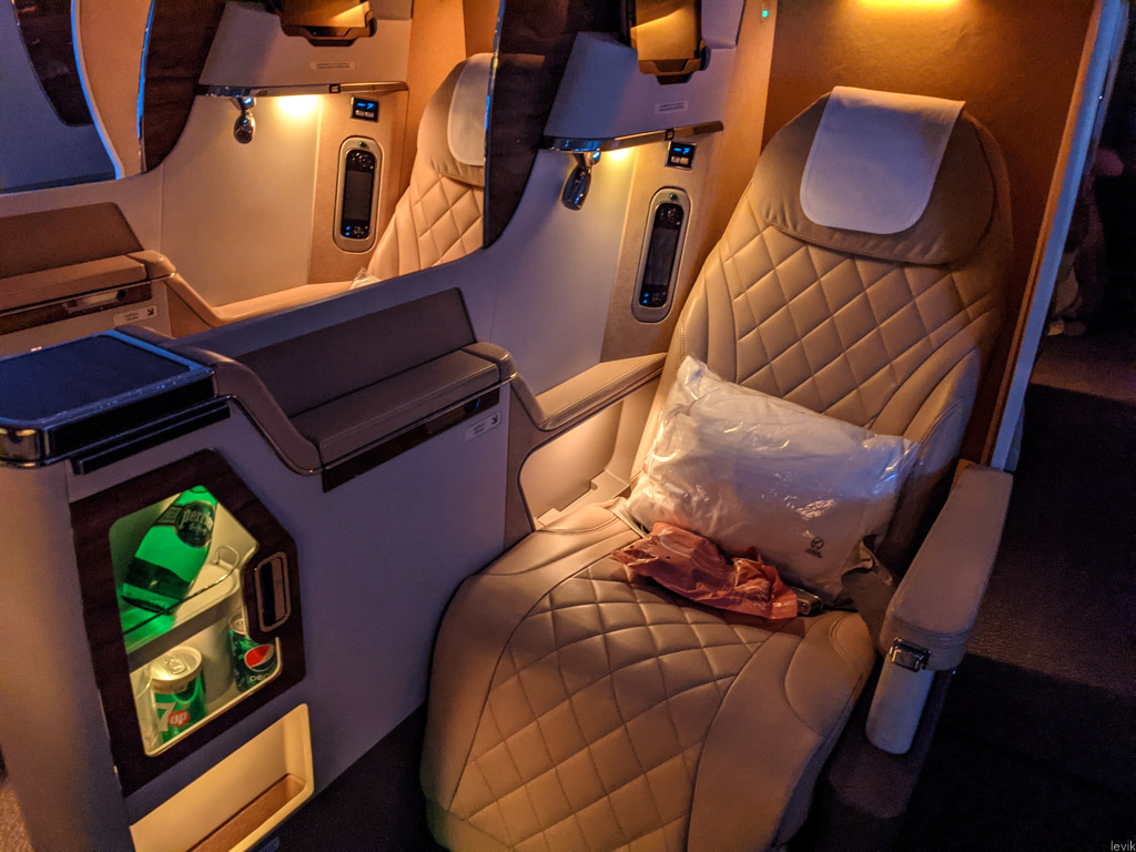 Я посидел на сайте авиакомпании, и нашёл несколько дней, когда билеты в первом классе можно было взять за мили. Загвоздка была в том, чтоб выбрать именно те рейсы, которые выполняются обновлёнными 777. В открытую об этом не пишут, но если посмотреть на план сидений, то их можно отличить: в новых салонах в первом классе всего по три места в ряд, тогда как в старых - по четыре. (Кстати, уверен, что и старые конечно же тоже очень роскошные, но лететь в первом классе старого поколения - это как покупать прошлогоднюю модель Айфона за те же деньги.)
