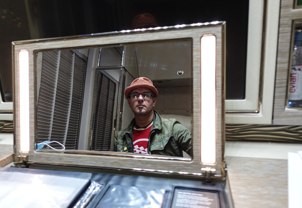 36. Ну а сама откидная крышка имеет вмонтированный свет, и зеркало, чтоб можно было во время долгого перелёта (12 часов туда, и 14 назад!) заняться своей внешностью.