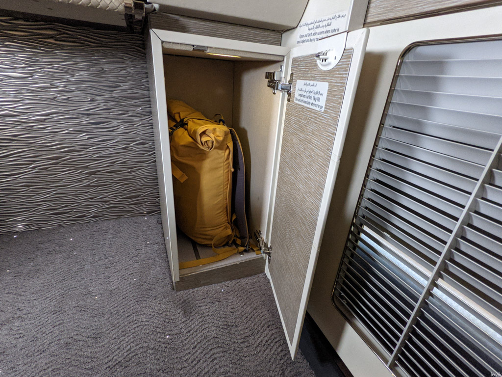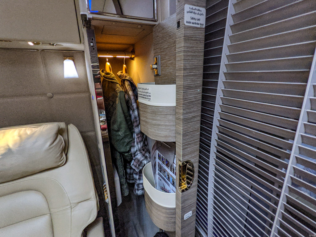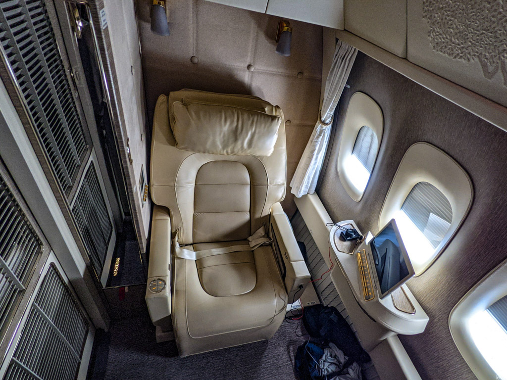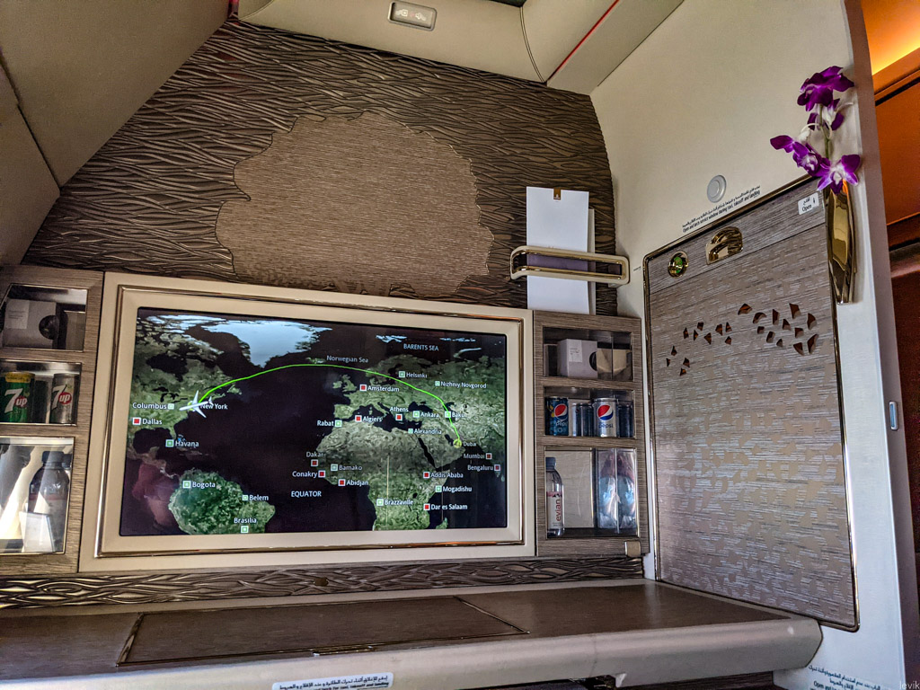 4. Итак, вот моё место на рейсе из НЙ в Дубай. Как видите, тут не так чтоб очень много места, но всё же это точно небольшая комнатка, а не просто кресло со стенками. Почитав разные отзывы в сети, я решил выбрать "среднюю" каюту. В первом классе тут всего шесть мест: два ряда по три места в каждом, и все писали, что именно среднее из них самое крутое и просторное, потому что обе стенки более менее прямые - нет изгиба фюзеляжа с одной из сторон.
