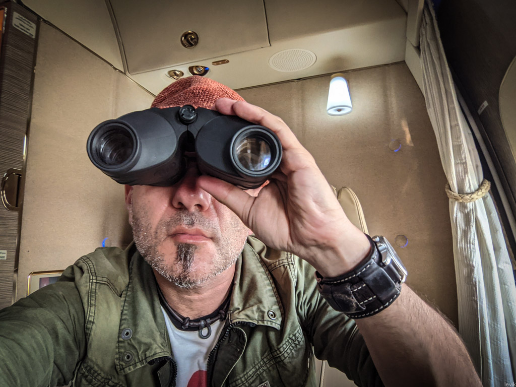 18. А на обратном пути, когда я сидел возле настоящих окон, а не виртуальных, выдали ещё и бинокль, чтоб лучше рассматривать виды. Бинокль был лёгкий, и не показался мне особо качественным.