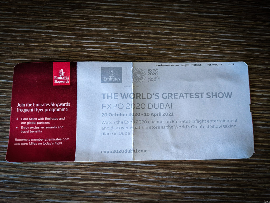 В этом отчёте фотографии с обоих перелётов - их можно различить по форме каюты, цветку на стене, и, конечно же, моей футболке. Кстати, заметил, что на посадочном, который мне выдали в JFK до сих пор рекламируют "прошлогоднюю" Всемирную Выставку (на самом деле её перенесли на год):