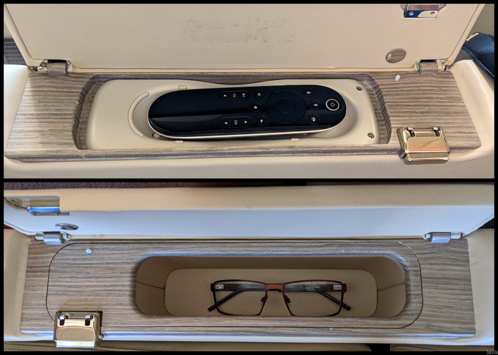 30. Внутри подлокотников спрятаны "потайные" отделения. В одном лежит пульт от телевизора (если для вас планшет - это слишком трудно). В другом - место для разных мелочей, которые вы наверняка забудете на борту. Я решился туда только очки положить, пока спал - без очков то я точно не уйду.