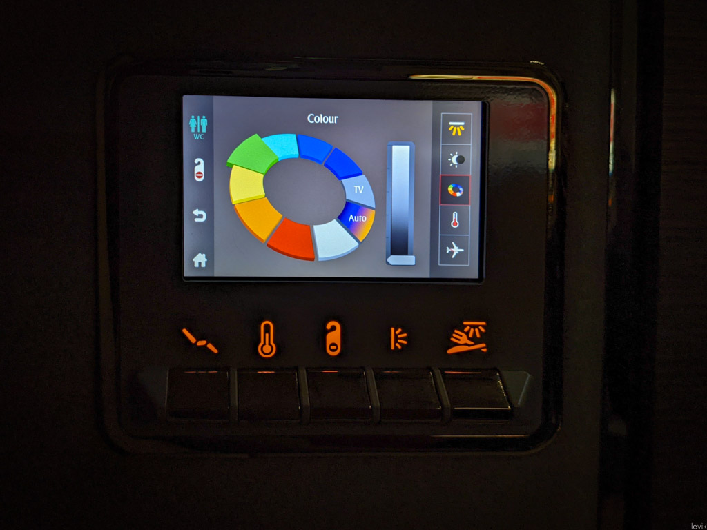 Заметьте, что кроме большого телевизора (32 дюйма!) возле кресла стоит ещё и планшет. Тут хитрая система развлечений, которую я так до конца и не освоил, но идея в том, что планшет можно снимать с основания, и использовать как пульт. Или начать смотреть кино на планшете, а потом "перекинуть" на большой экран. И наоборот. Вот интересно, можно ли смотреть разные фильмы на этих экранах? Жаль, только сейчас подумал об этом, а то обязательно бы попробовал.
