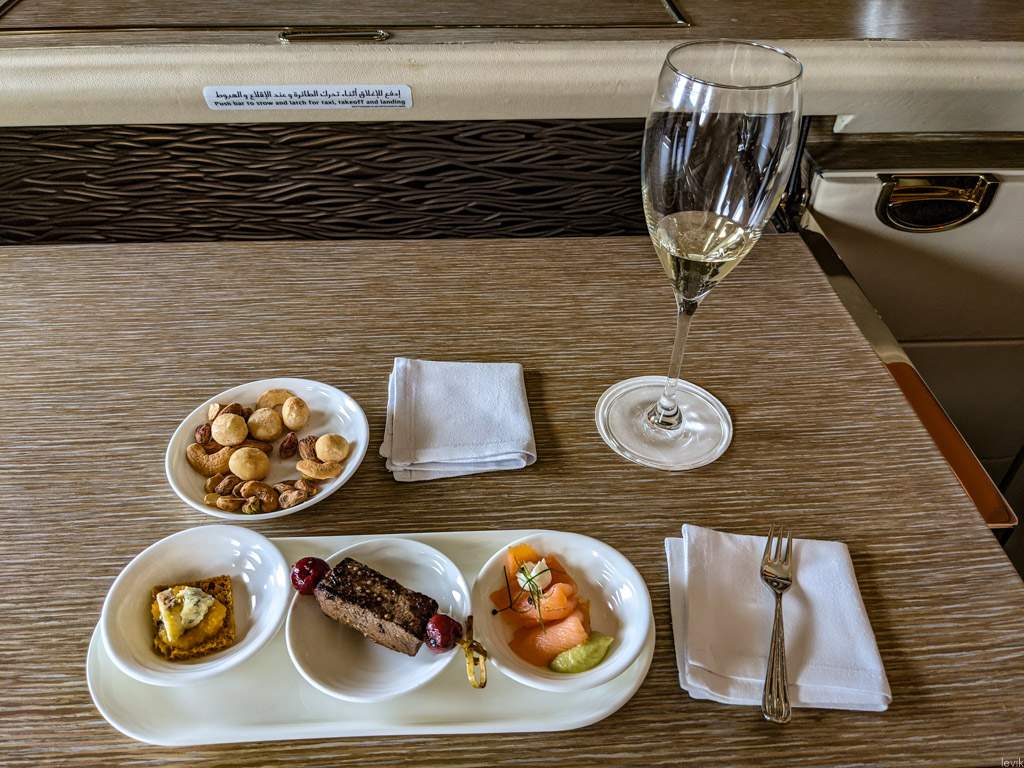 48. И ещё закуска (опять же, это два разных рейса). Но в общем всё что в меню можно заказывать в любой момент. "Это же первый класс," объяснил мне один из стюардов.