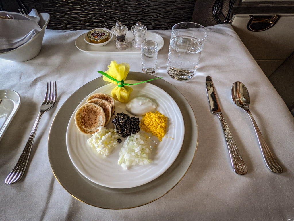 44. Затем - чёрная икра. Что за первый класс без неё?! "Кстати, у нас к икре полагается стопарик водки - Belvedere. Будете?" - Они и мёртвого уговорят.